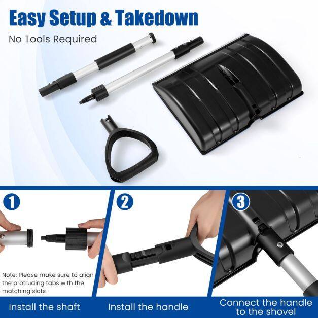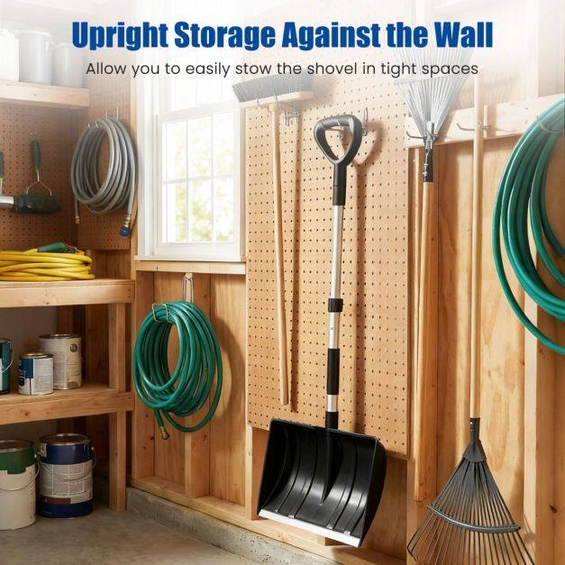 ● Easy Assembly & Storage: The snow shovel for driveway breaks down fully into 4 pieces, which can be quickly connected without tools. Therefore, it can be easily stored in your car trunk for emergencies. Also, you can hang it on the wall for compact storage.