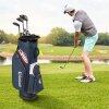 This golf bag features a 14-way divider top that helps keep your clubs neatly arranged and protected. Large storage capacity is provided by 6 zippered pockets, including a cooler pocket, 2 soft-lined pockets for valuables, a front small pocket for balls or tees and 2 full-length side pockets for apparels. The zippered rain hood protects your clubs from sun and rain, while the umbrella holder ensures you're prepared for changes in weather conditions. Besides, this lightweight golf cart bag comes with an adjustable padded shoulder strap and lifting handle, making it comfortable to carry.