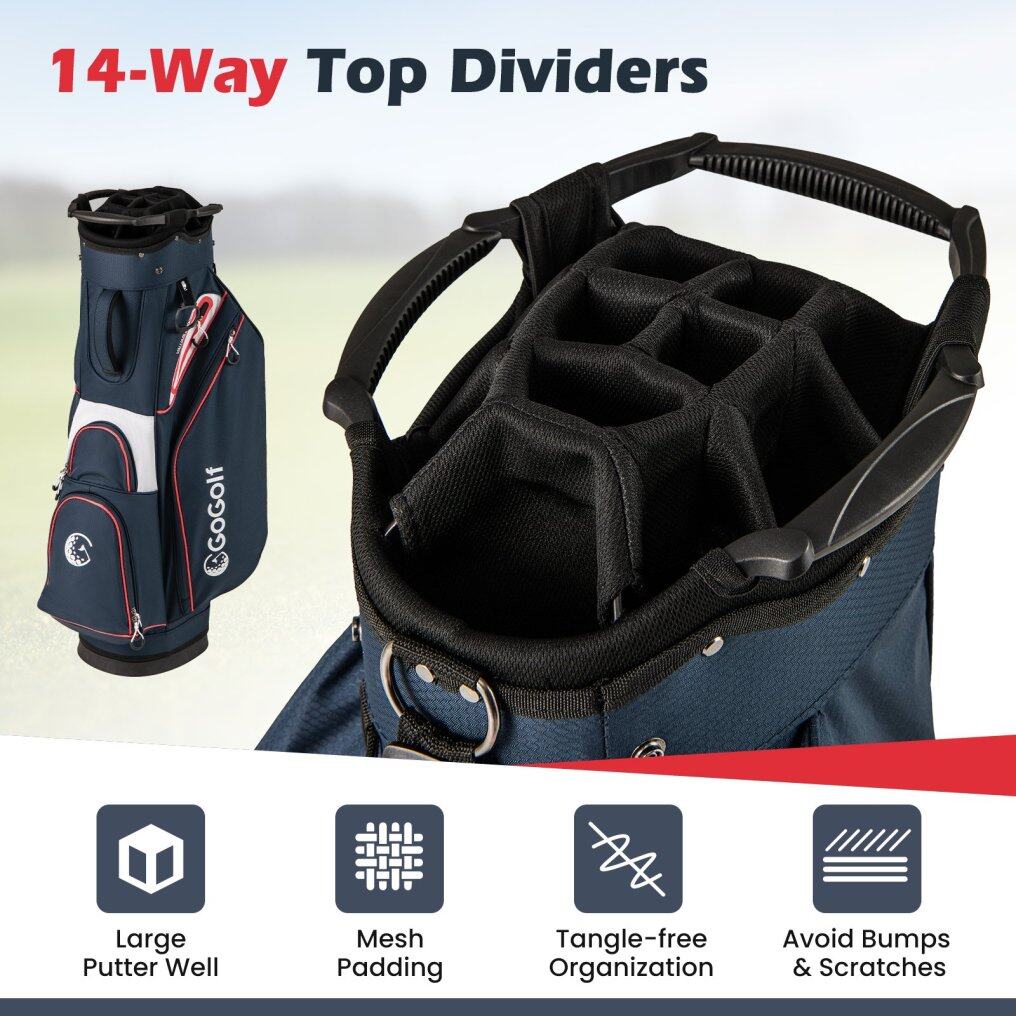 14-Way Divider Top: This golf cart bag features a 14-way divider top for optimal organization and protection of your clubs. The included oversized putter holder makes it easy to access. Please note that golf clubs are not included.