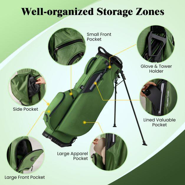 ● Efficient Storage Solution: This golf stand bag comes with 5 zippered pockets, including a soft lined valuables pocket with waterproof zipper, a small pocket for balls or tees, a large front pocket, a side pocket and a full length apparel pocket. All your golf necessities can be neatly stored.