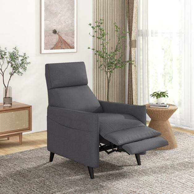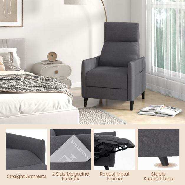 User-friendly and Stable Recliner: 2 straight armrests support your arms. 2 side magazine pockets offer added storage space for your items. Supported by 4 stable support legs, the chair can withstand a weight of 120 kg without wobbling.
