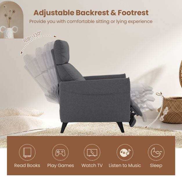 The recliner chair is a great gift choice for your family or friends. You can easily push the back to change its angle (108-130°) to acquire more relaxing experience. You can choose the most suitable position for reading books, watching TV, playing games or napping. Besides, the retractable footrest can also be adjusted from 0° to 90°, supporting your legs. Skin-friendly linen fabric, bouncy sponge and premium PP cotton make you feel comfortable when you sit or lie down on the chair. Heavy duty metal frame and solid legs keep it strong and steady. Additionally, it measures 81 cm x 68 cm x 106 cm (L x W x H), which is ideal for the living room, bedroom, home theater or home office. Buy and enjoy leisure time now!!!