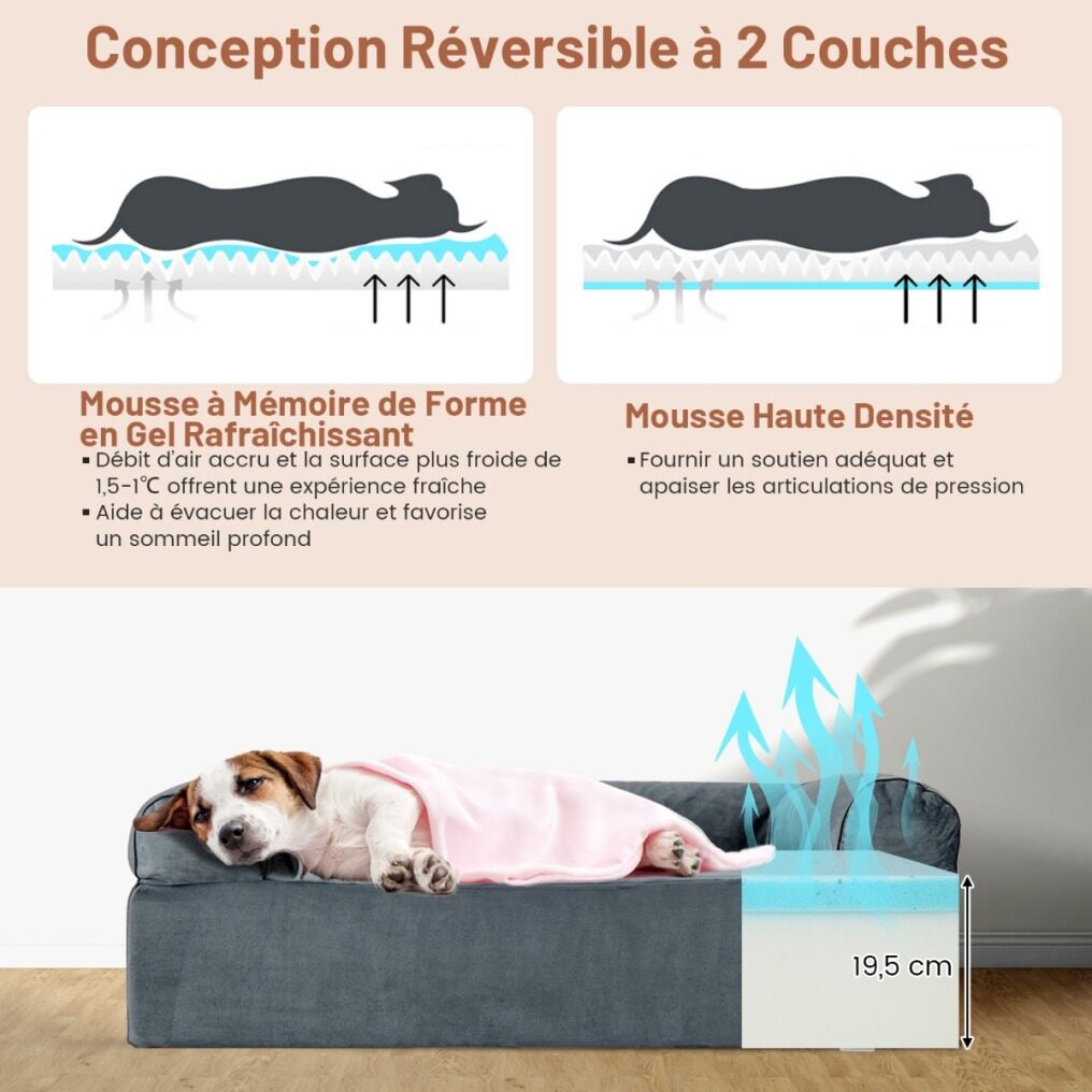 【Dual-Layer Foam Support】The dog sofa bed features a 2-layer reversible design. With cooling gel-infused memory foam, the orthopedic dog bed can help dissipate heat and promote deep sleep. Meanwhile , the high-density memory foam will provide adequate support and soothe pressured joints.