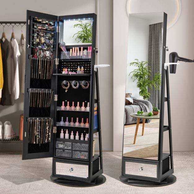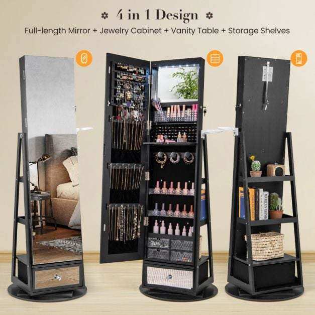● 360° Smooth Swivel and Safety Lock: Thanks to the flexible 360° rotating design, you can easily fetch items stored at the back of the jewelry cabinet. Plus, the jewelry armoire features a lockable door with keys to keep your belongings safe, while the magnetic catch design prevents the door from unwanted opening.