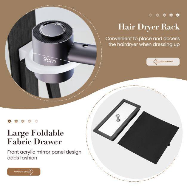 ● Upgraded Convenience and Chic Design: This mirrored jewelry cabinet comes with a hair dryer rack, making it convenient to place and access the hairdryer when dressing up. In addition, the large foldable fabric drawer at the bottom with a front acrylic mirror panel design adds fashion.