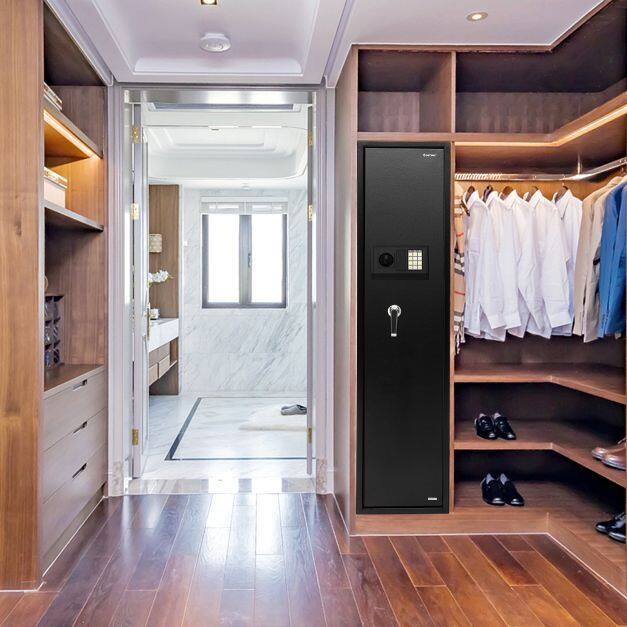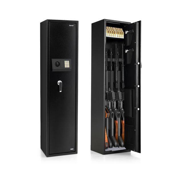 Keep your firearms secure and easily accessible with the gun safe! The spacious interior of the gun safe can easily accommodate 5 rifles while the ammo lockbox and several storage pockets allow you to store your ammunition separately and securely. With a digital keypad and emergence keys, you can access your guns quickly and securely. The heavy-duty construction and advanced locking mechanism guarantee maximum security, keeping your guns out of reach from unauthorized access. Whether you're a hunter, sport shooter, or collector, the rifle security cabinet is an essential investment for enhanced firearm safety.