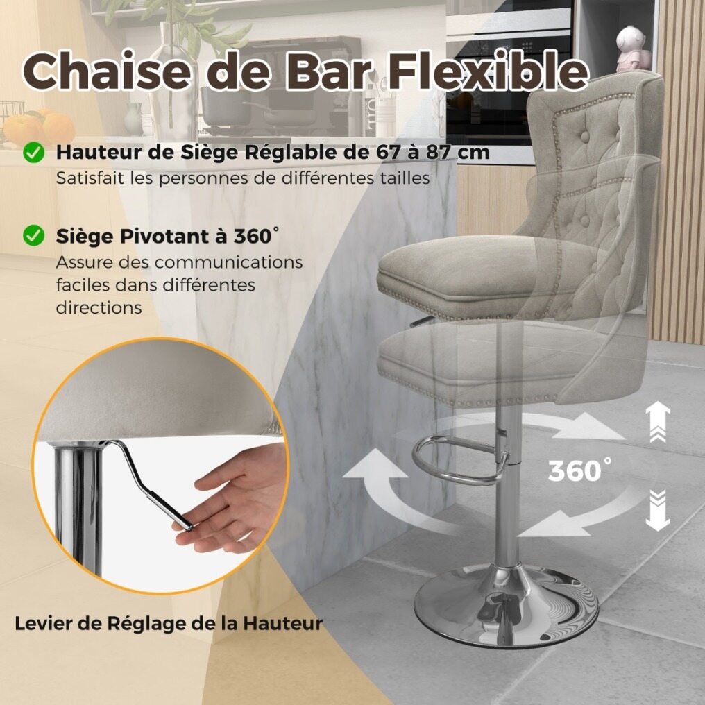 ● Customized Bar Chair: Each bar stool provides a 26.5"-34.5" adjustable seat height, giving your guests full freedom to find the comfiest position. Meanwhile, its seat is 360° swivel, catering to the need to socialize with friends in different directions.