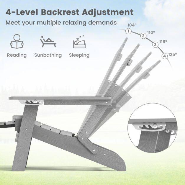 Featuring a 4-level adjustable backrest, these lounge chairs allow you to comfortably read, sunbath, and nap. Made from premium all-weather HIPS material and reinforced with stainless steel screws, the Adirondack chair stands against all climatic conditions, ensuring durability and low maintenance. The cozy seat includes a rotatory cupholder for your drinks or gadgets, enhancing its utility. With quick-folding design and retractable footrest, the oversized chair is space-efficient and easy to store and move. Elevate your backyard or patio area with this stylish and functional Adirondack chair, a perfect blend of comfort and convenience for any home.