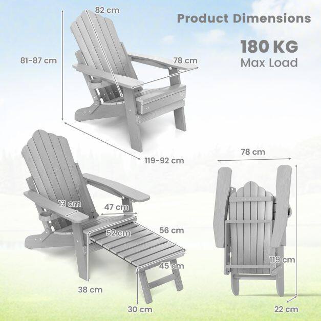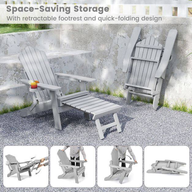Space-Saving Storage: These innovative folding chairs are ideal for any space, big or small. The Adirondack chair with retractable footrest and quick-folding design facilitates easy transport and convenient storage, making it perfect for seasonal use or occasional guests.