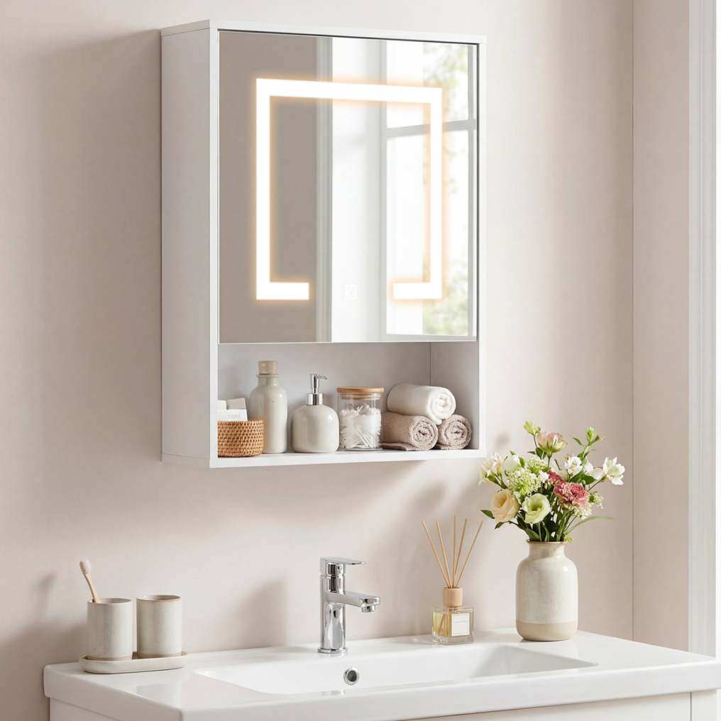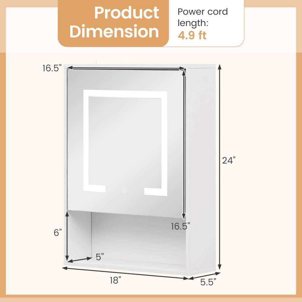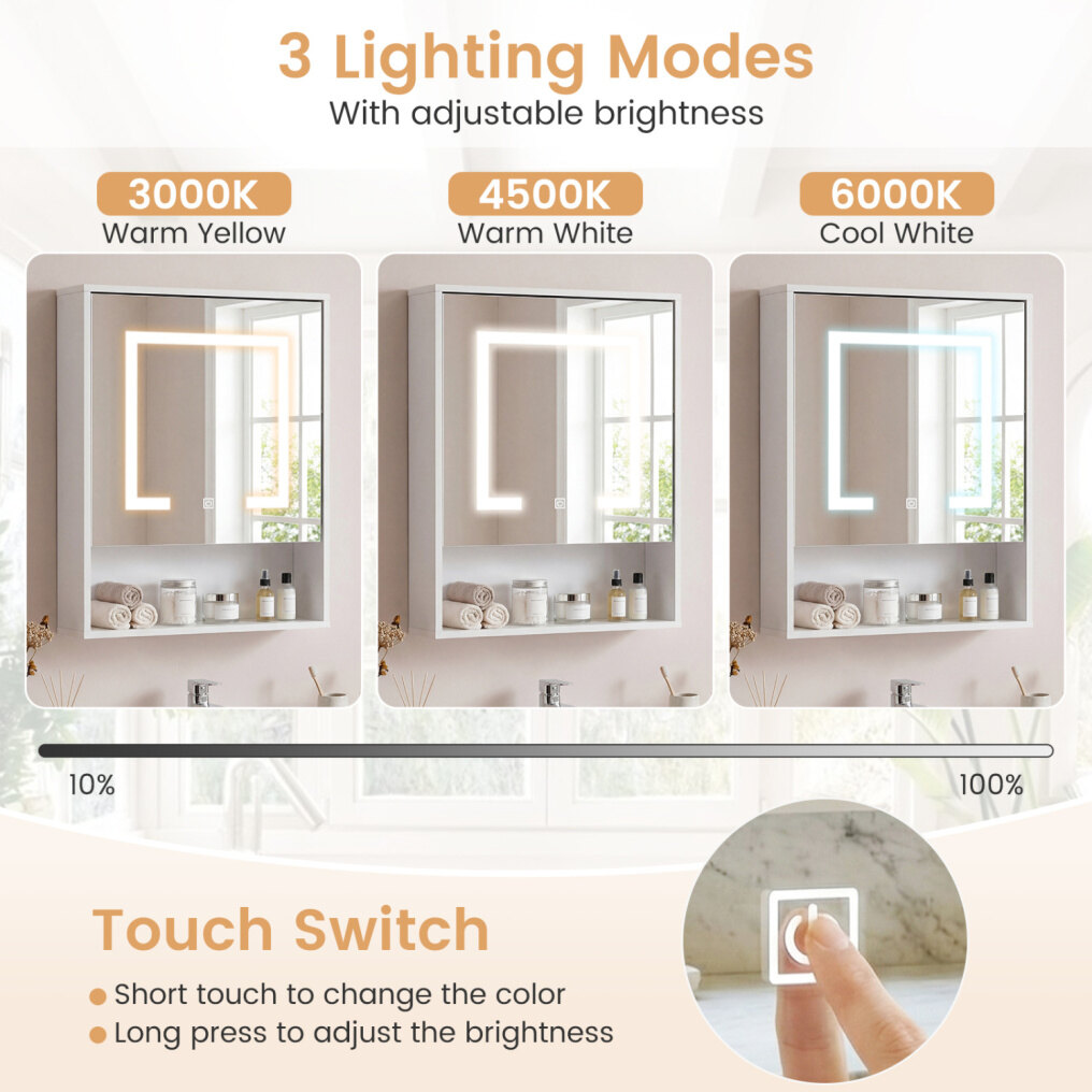 ● Customizable Lighting Options: This lighted wall cabinet feature 3 lighting modes (3000K warm yellow, 4500K warm white, and 6000K cool white) with adjustable brightness from 10% to 100%, allowing you to choose the perfect ambiance for your space. The control is simple via the touch switch.