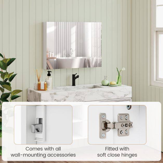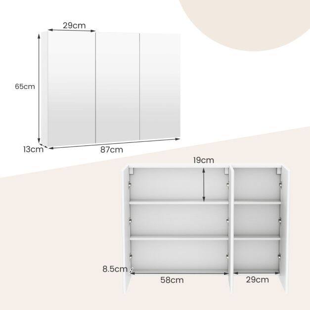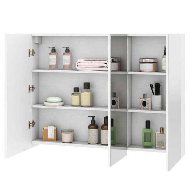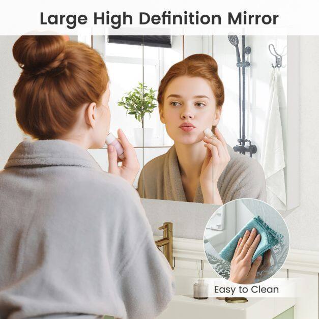 Large Storage Space: This medicine cabinet is designed with 3 high-definition mirrored doors and utilizes the wall space to create more storage capacity. 6 storage compartments are enough to store your toiletries, cosmetics, skincare products and more.