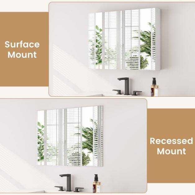 This bathroom wall cabinet is combined 3 mirrored doors with 6 storage compartments to meet your different needs in 1, which is space-saving and optimal for small bathrooms. Besides, 4 shelves inside the cabinet are height adjustable, which are adjustable according to different storage needs. This medicine cabinet comes with wall-mounting screws and is available for 2 installation ways: recessed mount or wall mount.