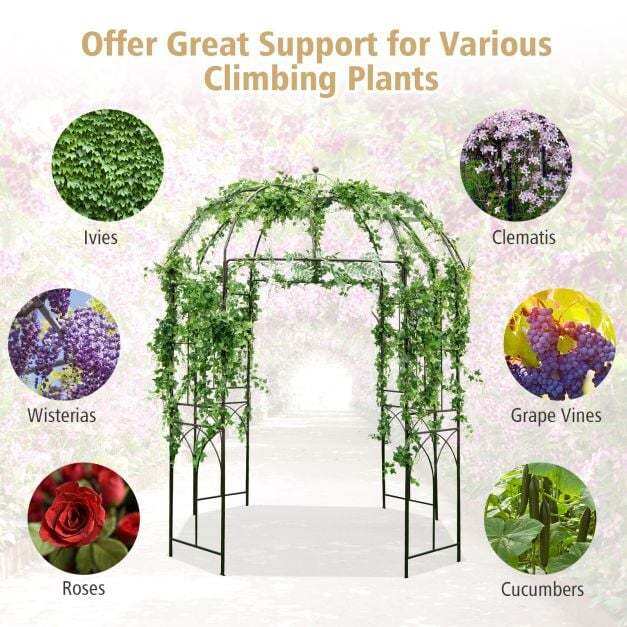 Large Planting Area: The arch arbor is designed with 4 long climbing trellises and a climbing arch, providing large space for various climbing plants to grow, such as ivy, clematis, wisteria, grape vine, morning glory, and more. And there exists a hook on the top for hanging flower baskets.