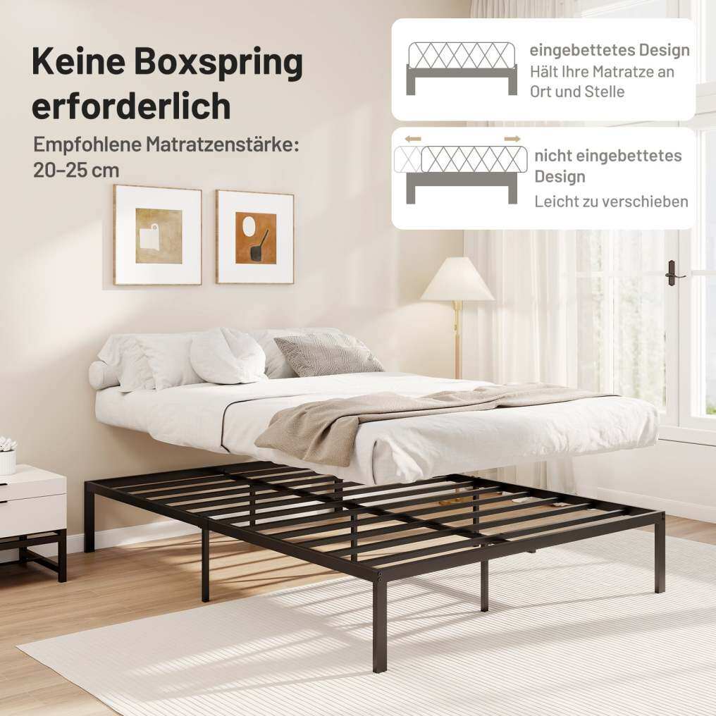 Upgrade your bedroom with this sturdy metal platform bed! Made from durable metal slats, the bed frame provides stable and even support with a high weight capacity. The recessed design securely holds the mattress in place, preventing slippage and noise. Additionally, sound-dampening foam in critical areas ensures a quiet and stable sleeping environment. The 26.5 cm clearance under the bed offers ample space to organize your belongings. This modern platform bed is perfect for anyone looking to add a unique touch to their sleeping space.