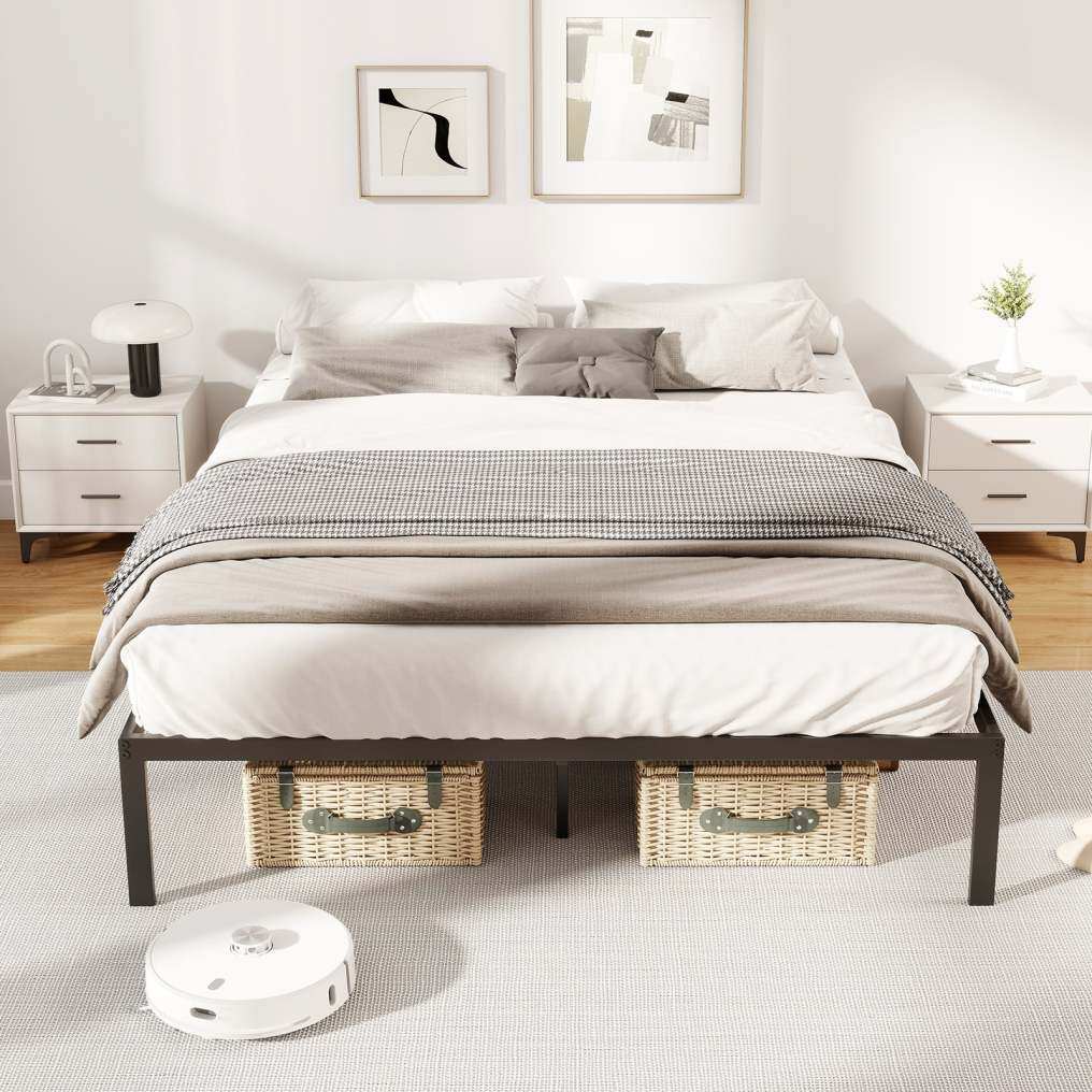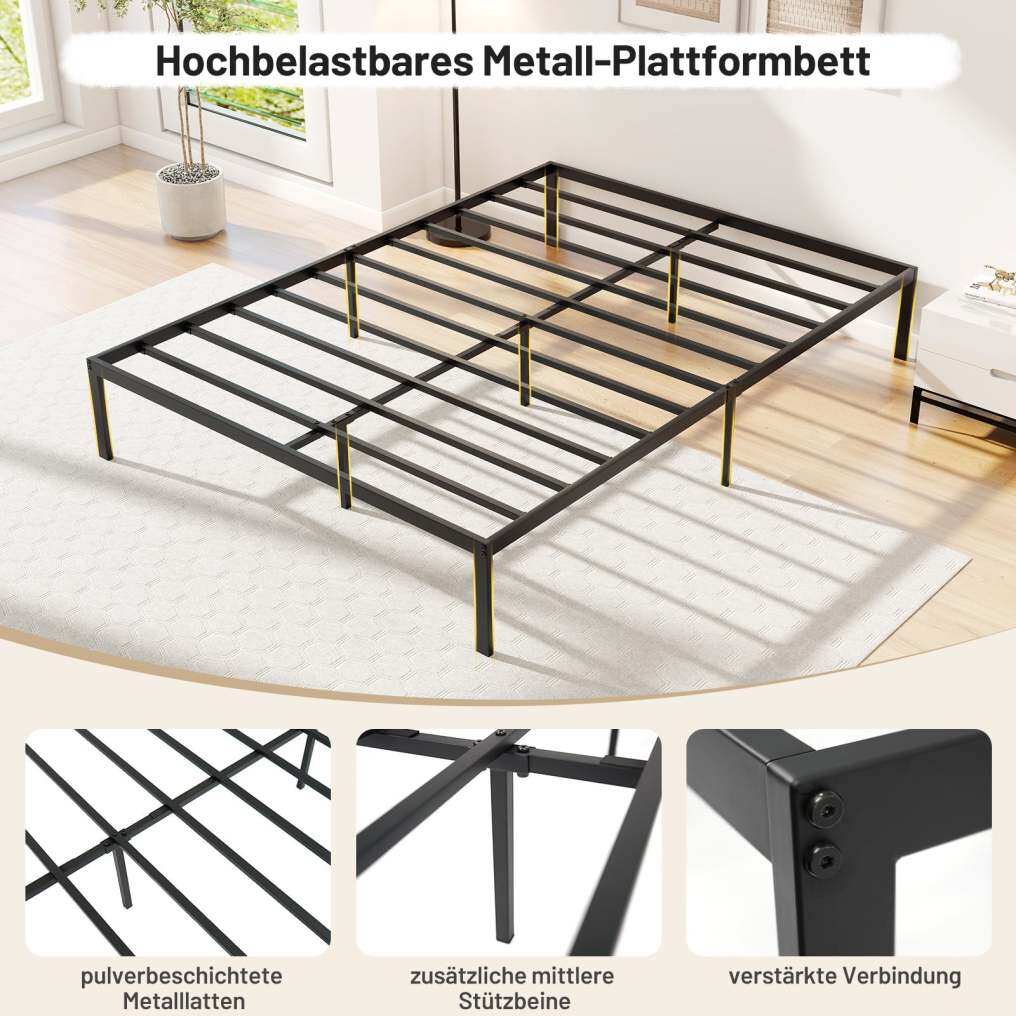 Robust metal construction: Made from a sturdy metal frame with reinforced joints, the Full/Queen/King bed frame can support up to 300 kg (Full/Queen) and 400 kg (King). Eleven thick metal slats and 5/5/8 sturdy support legs provide additional stability.