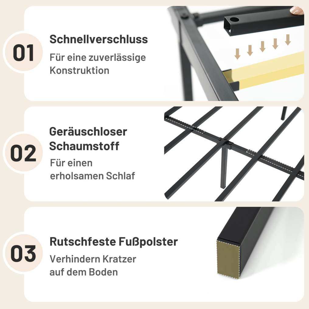 Silent sleeping comfort: With foam padding at the frame joints, the platform bed offers a peaceful night's sleep. The recessed design ensures a secure fit for the mattress. Protective feet on the lower legs prevent slipping.