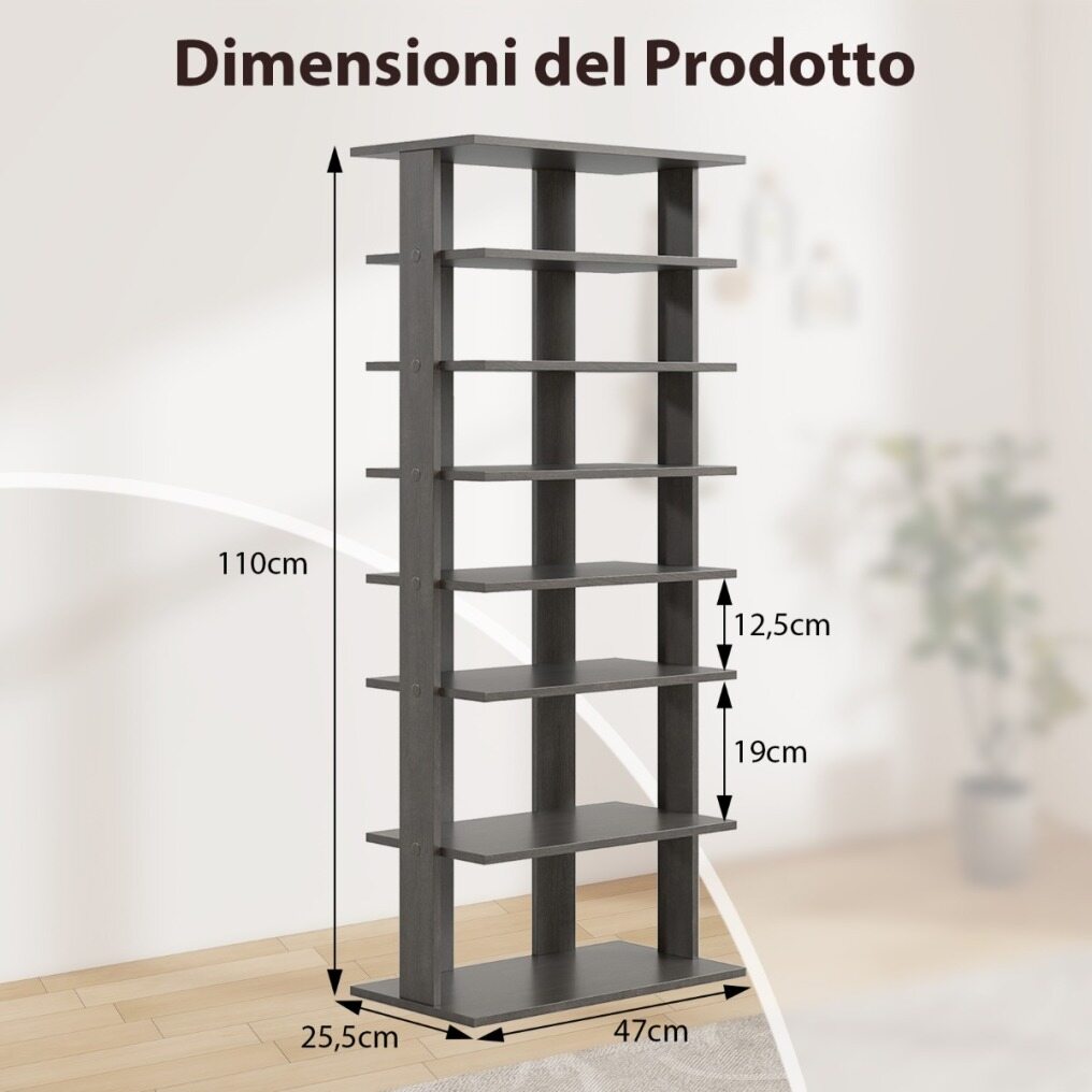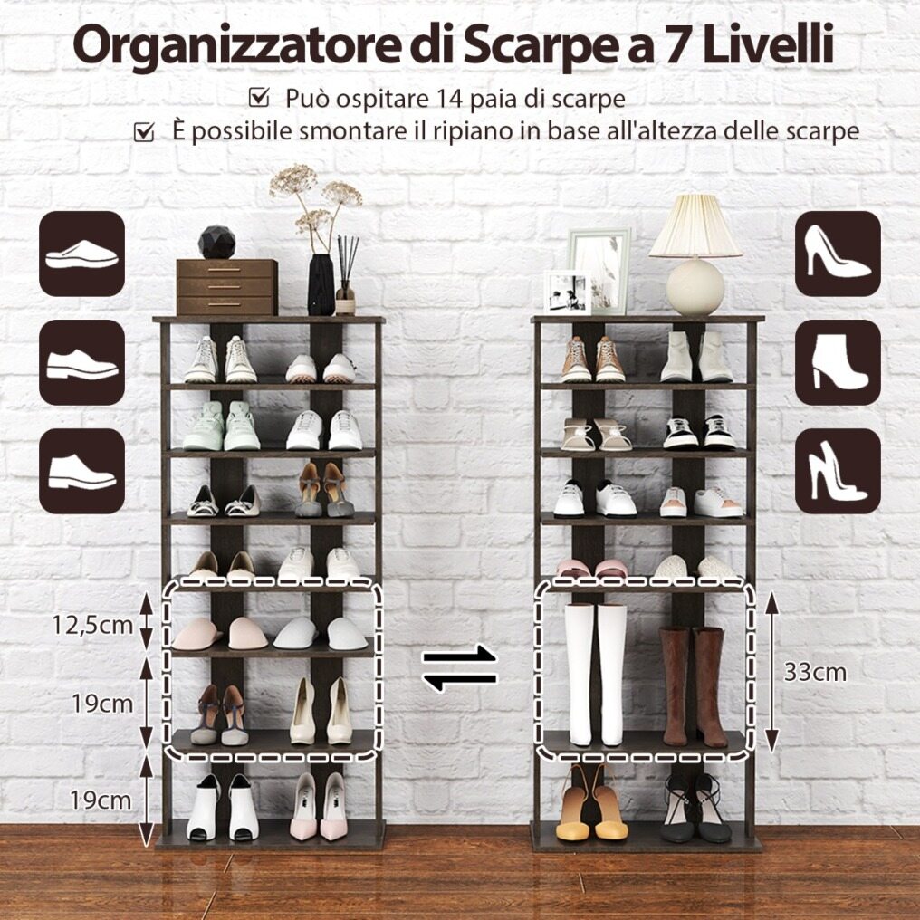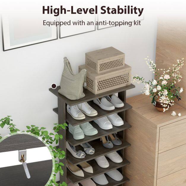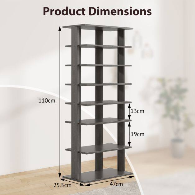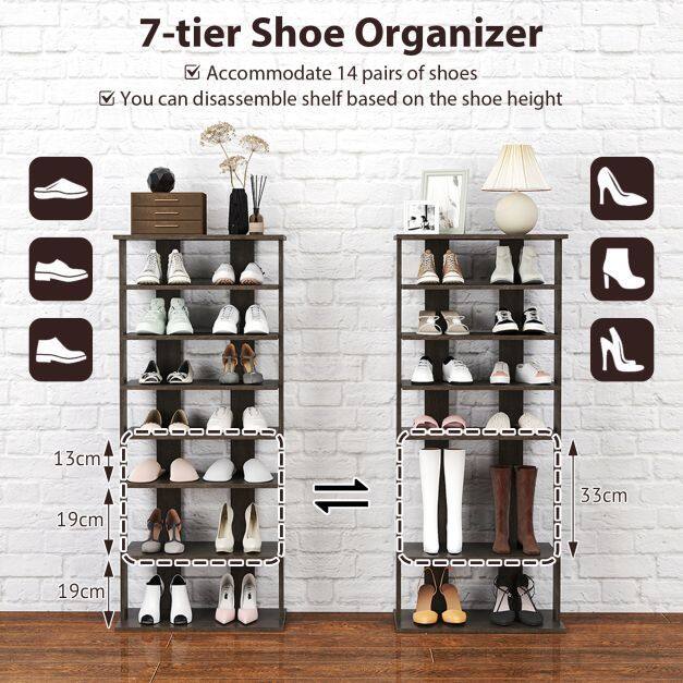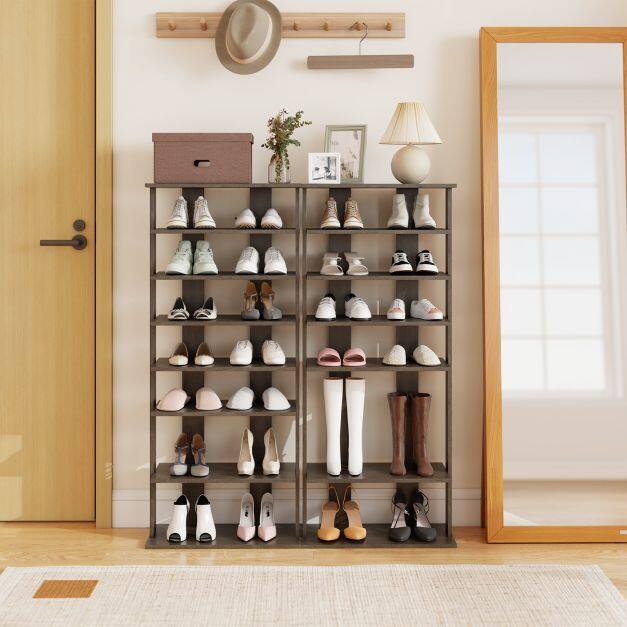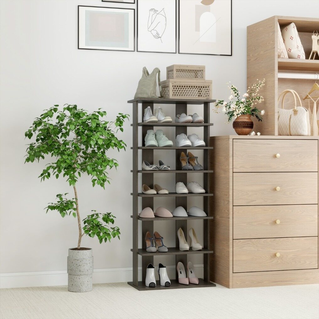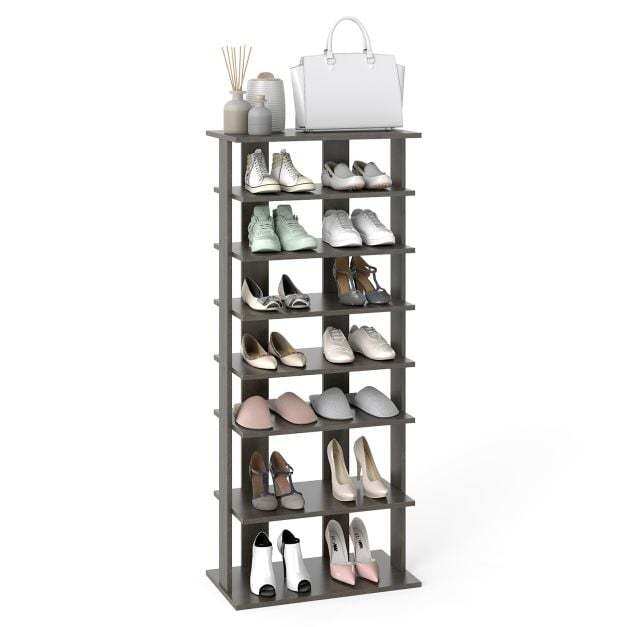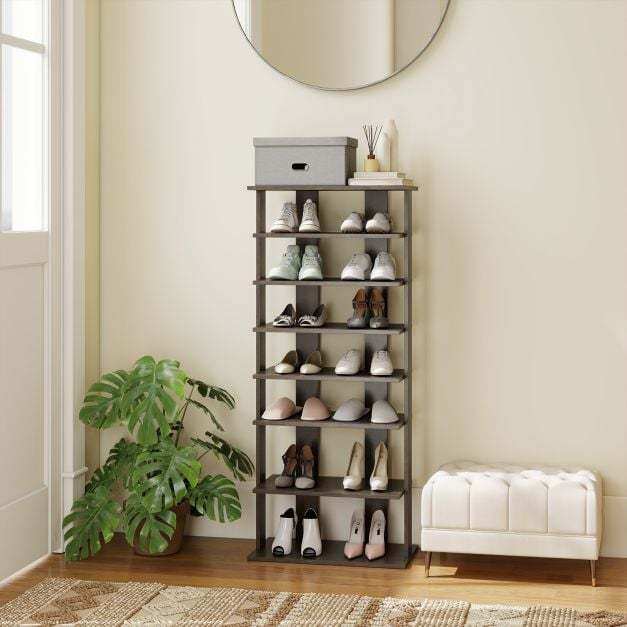 7 Tiers and Double Pairs : This vertical shoe rack helps keep your entryway organized. The entryway shoe rack features 7 tiers, each holding up to two pairs of shoes, so you can store more shoes. Plus, the open design makes it quicker and easier to grab your shoes.