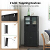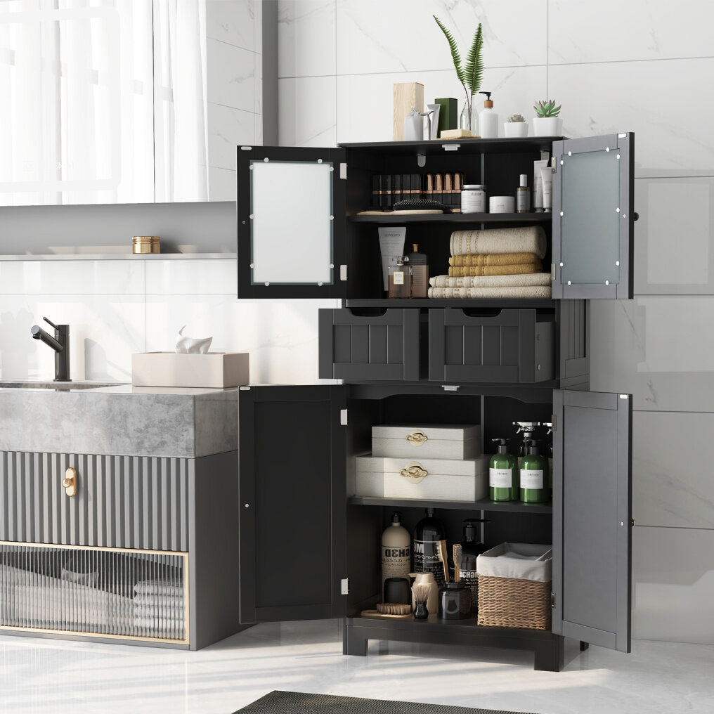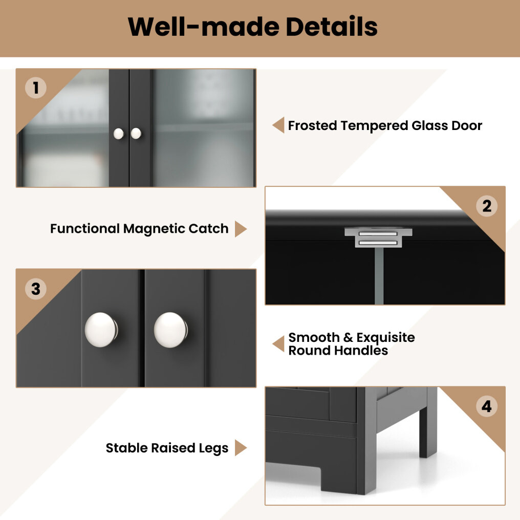 Featuring a large tabletop, a 2-tier upper cabinet with tempered glass doors, 2 drawers and a 2-tier lower cabinet with doors, this freestanding cabinet provides ample categorized storage space for various items, such as toiletries, crafts, books, tableware and so on. We would like to point out that the shelves can be adjusted to 3 different positions or removed, so you can store items of different heights. Made of thick and sturdy MDF, we guarantee that this product will last for a very long time. Additionally, it has 2 anti-tipping devices to protect the safety of you and your family. With a modern look and multifunctional design, this 4-door floor cabinet is suitable for different occasions, such as bathroom, living room, kitchen, etc.