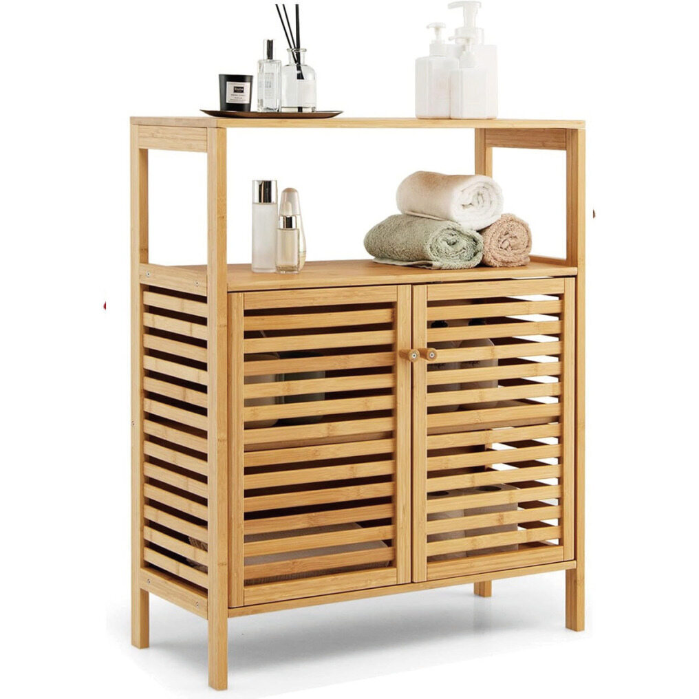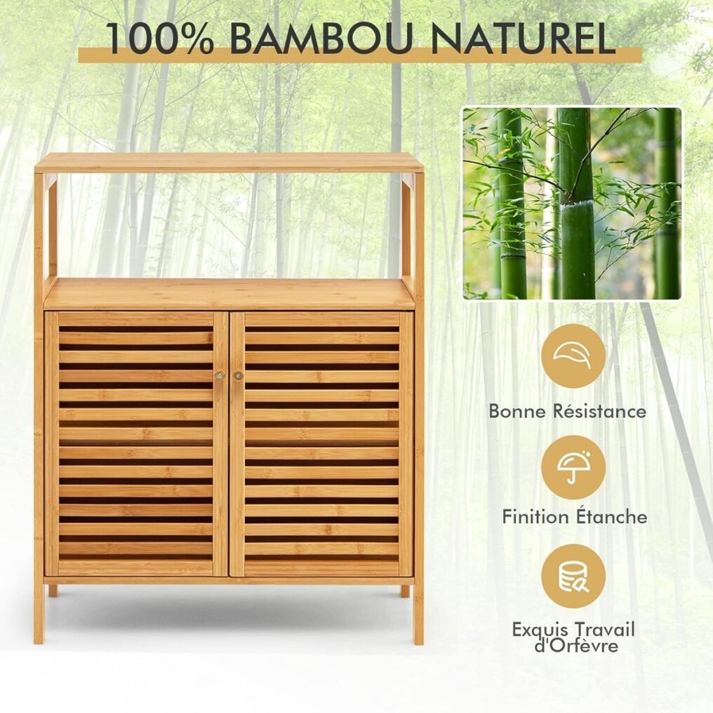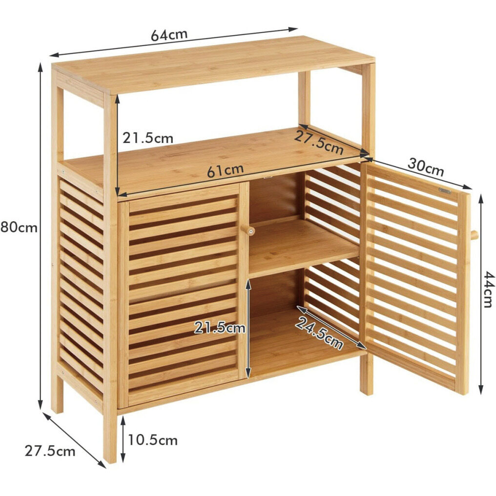 Our bathroom cabinet features a spacious worktop, an open shelf, and ample storage space for various items. With its practical design and compact size, it can be used as a bathroom cabinet, side organizer, or entryway cabinet. Made from natural bamboo, it is sturdy, odorless, and durable. This cabinet has two slatted doors for ventilation and raised feet to prevent water stains and dust accumulation. It also features elegant door knobs and a magnetic closure for easy access. The waterproof surface ensures easy cleaning, and the detailed instructions make assembly straightforward.