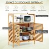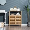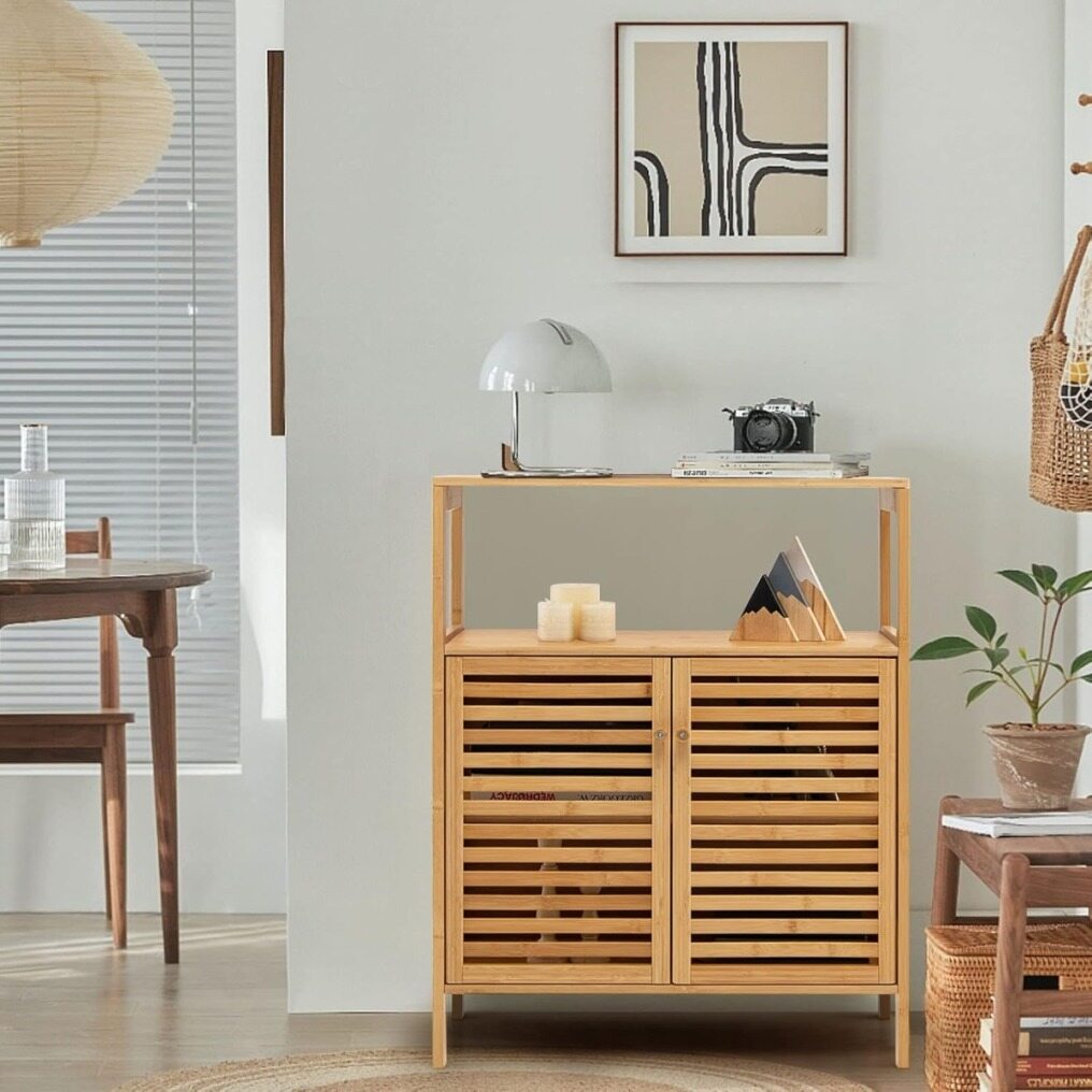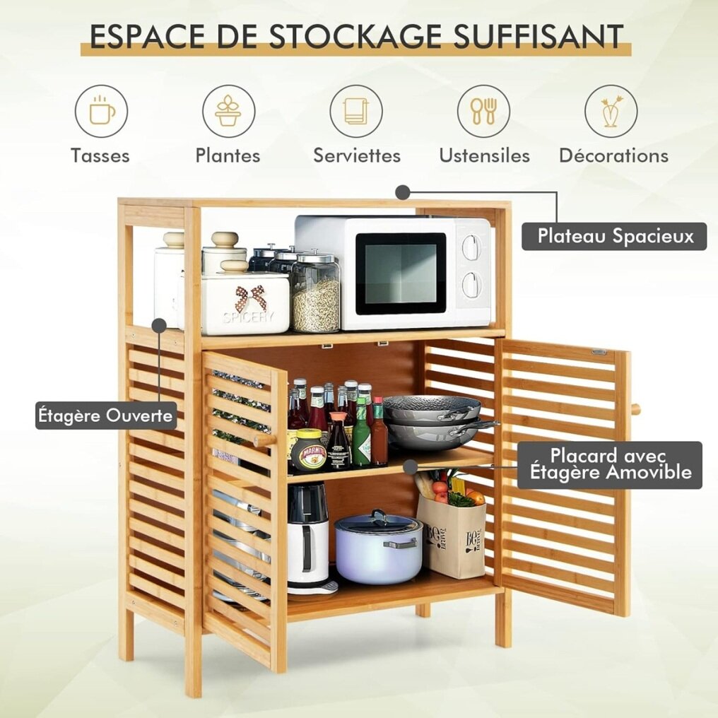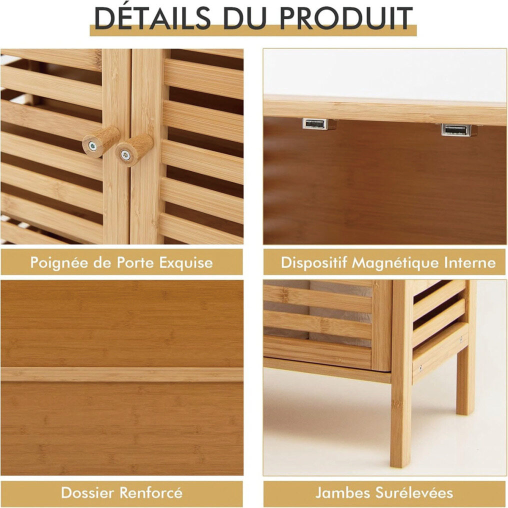 Our bathroom cabinet features a spacious worktop, an open shelf, and ample storage space for various items. With its practical design and compact size, it can be used as a bathroom cabinet, side organizer, or entryway cabinet. Made from natural bamboo, it is sturdy, odorless, and durable. This cabinet has two slatted doors for ventilation and raised feet to prevent water stains and dust accumulation. It also features elegant door knobs and a magnetic closure for easy access. The waterproof surface ensures easy cleaning, and the detailed instructions make assembly straightforward.