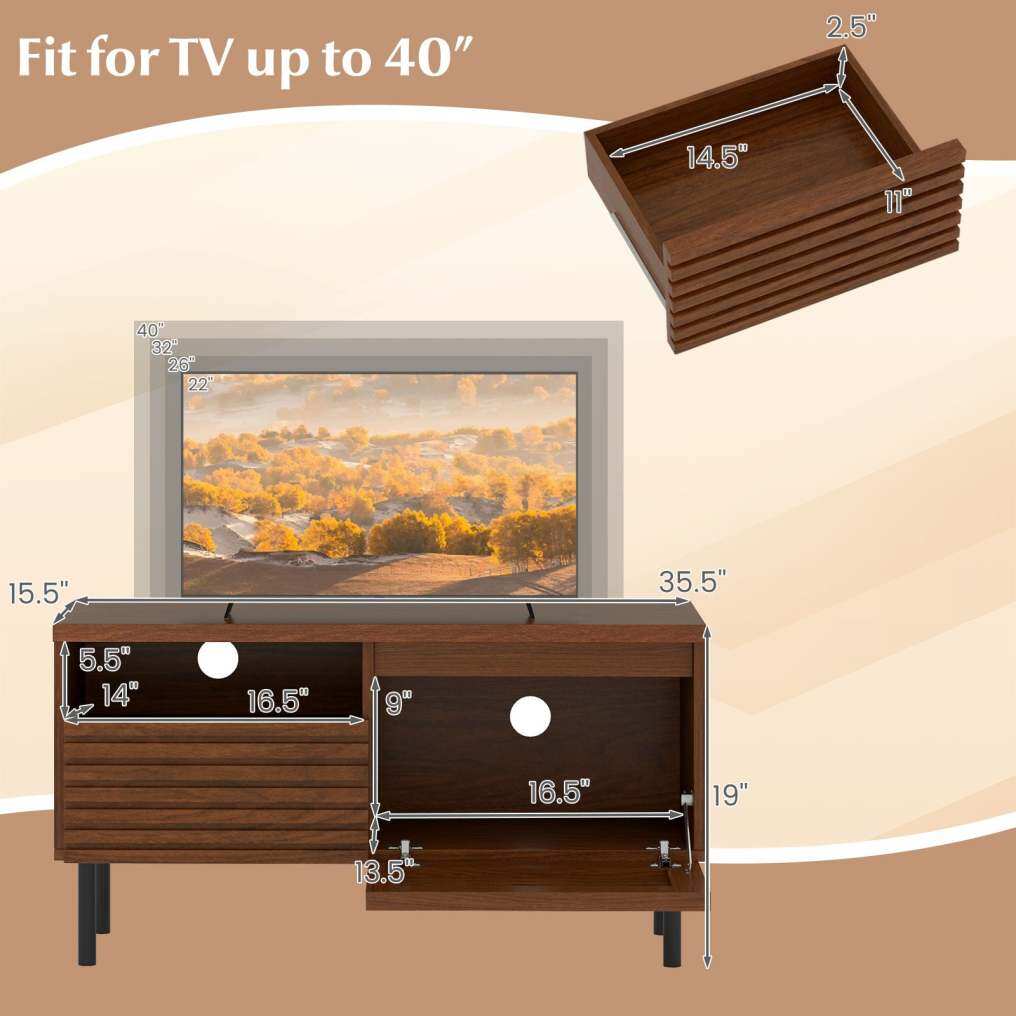 ● TV Stand for TV up to 40": Measuring 35.5" x 15.5" x 19", this entertainment center is designed for televisions up to 40 inches. Moreover, this stand fits neatly in smaller spaces, allowing you to maximize your area while enjoying your favorite movies.
