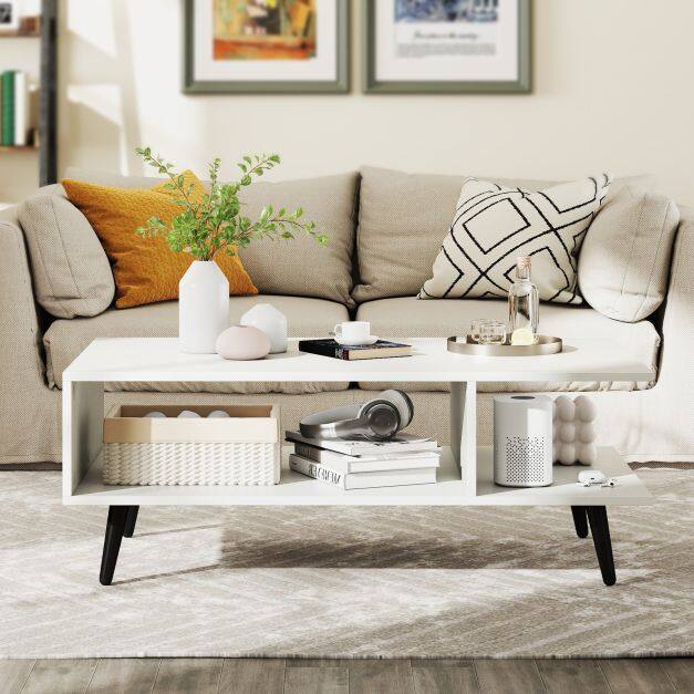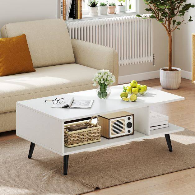 Spacious Storage: This coffee table features a two-tiered design with a large tabletop and an open shelf with a divider in between. It provides ample storage space for various items, keeping your living room organized and tidy.