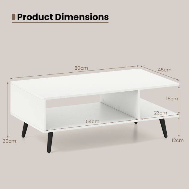 Transform your living space with the ultra-modern and multifunctional coffee table! This sleek, sturdy, and incredibly stylish 2-tier coffee table not only offers ample storage with its spacious top and additional shelf, but also stands as a central element in any room. Equipped with sturdy, tapered metal legs that support up to 80 kg, it offers long-lasting stability. Perfectly sized (80 x 45 x 30 cm) for every occasion, from family game nights to cozy evenings with a book. Plus, with easy-to-clean features and floor-protecting pads, it's as practical as it is chic. Improve the look and functionality of your living room today!