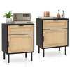 The rattan weaving style and black wood grain enhance aesthetic appeal and add a different flair to your room. Each nightstand features a wide top, a spacious drawer and a sleek cabinet, providing ample storage space for your essential items. Safety is also a priority in this design. The side tables come with anti-toppling device for stability and supported by metal legs for sturdiness. Designed for versatility, these nightstands serve not only as classic bedside tables but also as sophisticated sofa side tables for your living room.