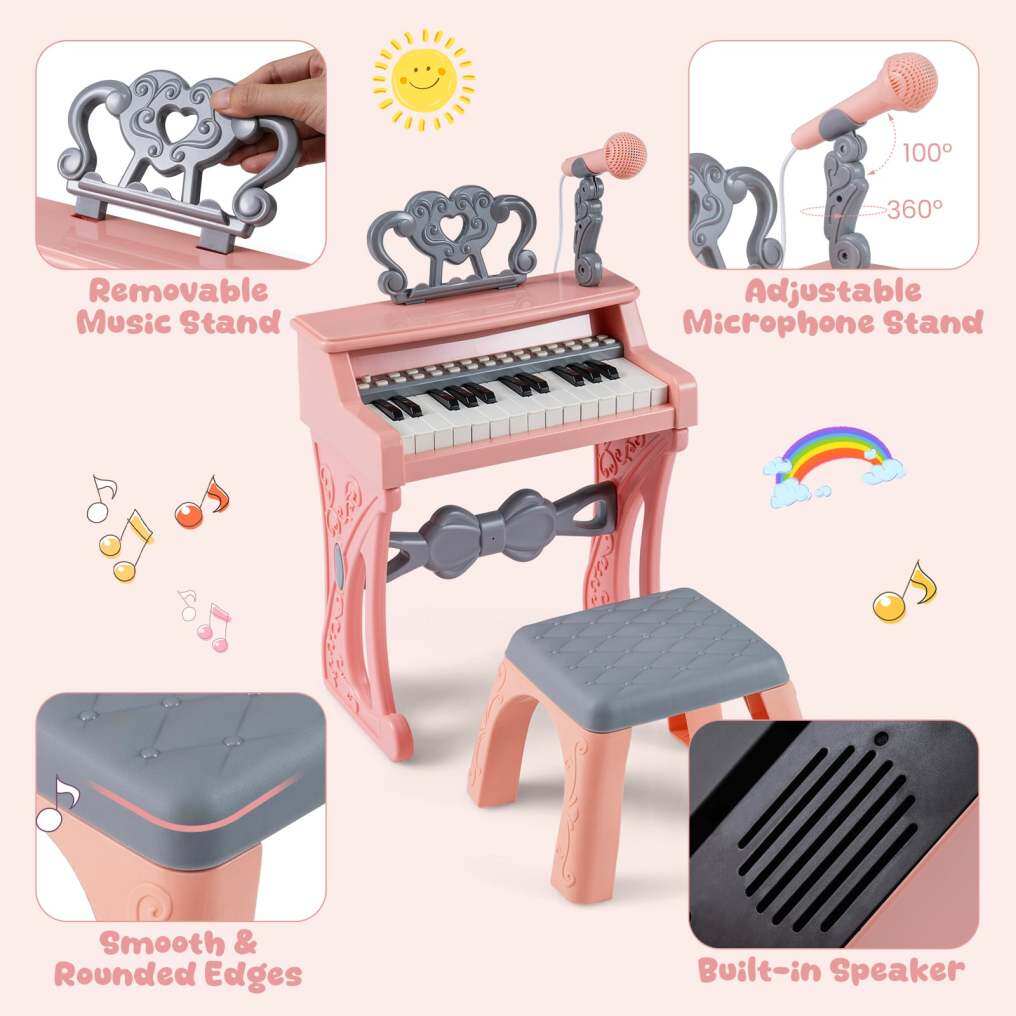 Customizable Setup: The detachable legs allow kids to play on the floor or on the table. The included removable music stand and adjustable microphone stand (microphone included) encourage creative performances, while the built-in speaker provides clear, lively sound.
