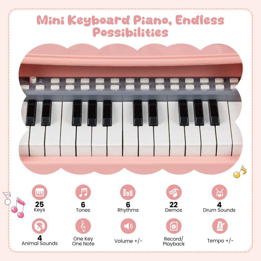 Mini Keyboard Piano, Endless Possibilities: This mini piano toy provides endless fun with 6 tones, 6 rhythms, 22 demos, 4 drum sounds, and 4 animal sounds. The record and playback feature lets kids create and enjoy their musical masterpieces, while volume and tempo controls offer a personalized musical experience.