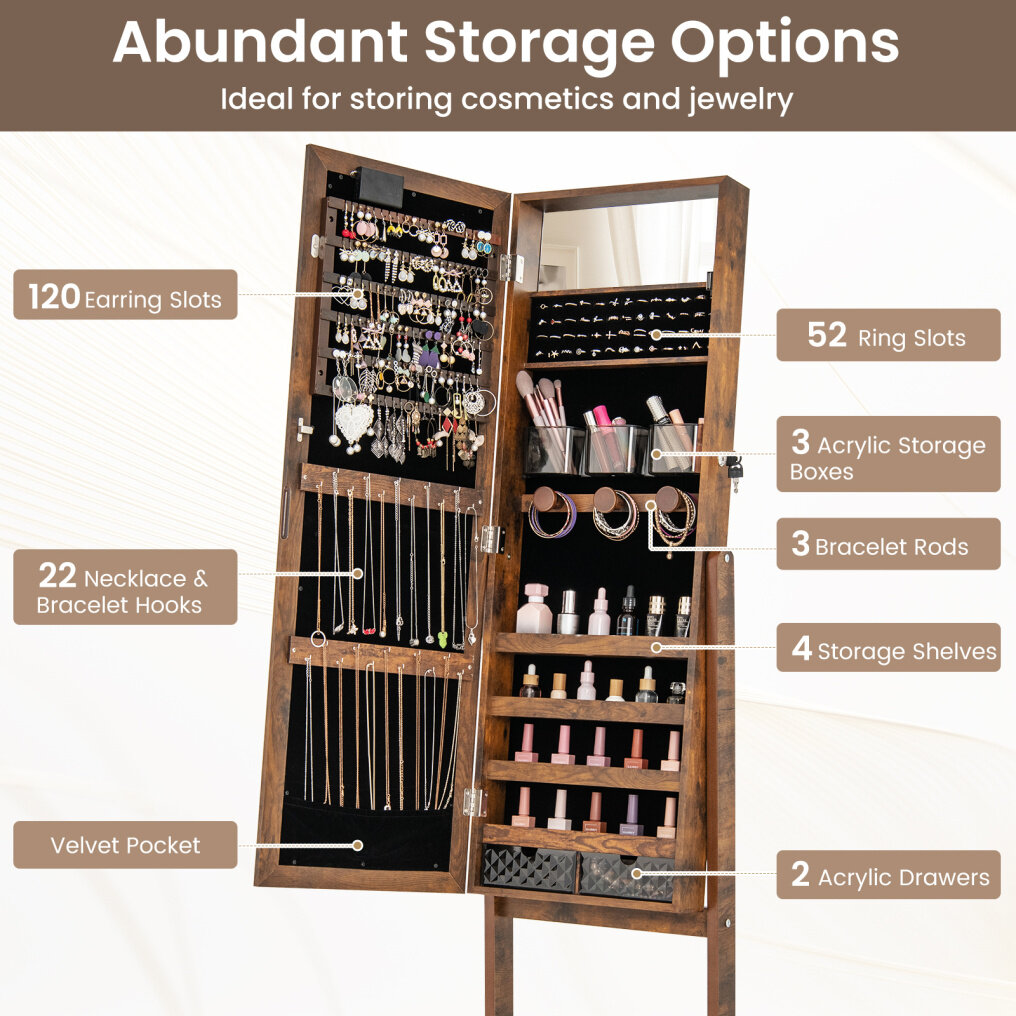 ● Abundant Storage Options: The jewelry armoire features 120 earring slots, 52 ring slots, 22 necklace & bracelet hooks, 4 storage shelves, 3 acrylic storage boxes, 3 bracelet rods, 2 acrylic drawers, and 1 velvet pocket. It is ideal for storing cosmetics and jewelry.