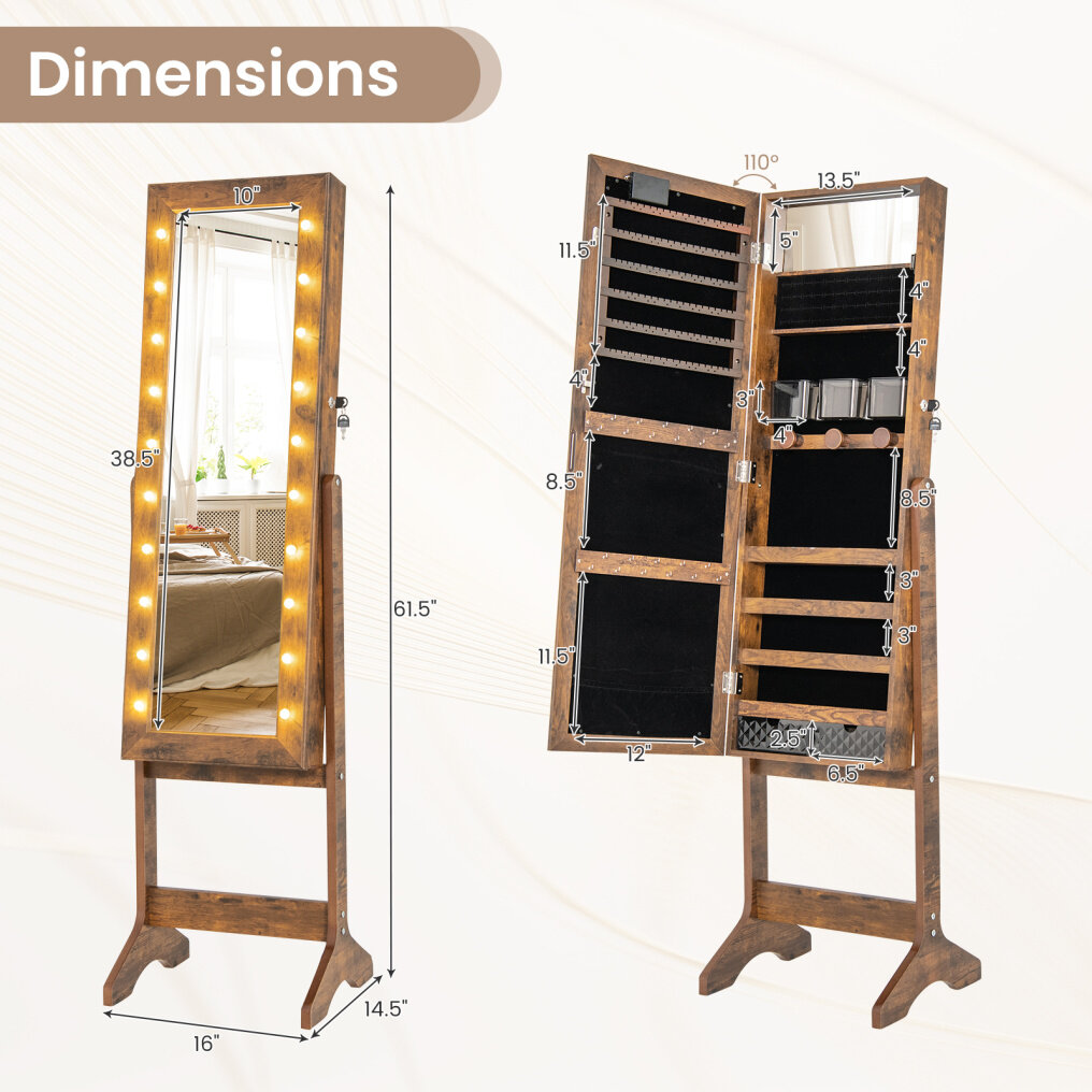 ● Lighted Full Length Mirror: The jewelry organizer is equipped with a full-length mirror for HD reflection, allowing you to check your outfit. Moreover, there are 20 bright lights decorated on the mirror for a romantic atmosphere. The lighting requires 3 AA batteries, not included.