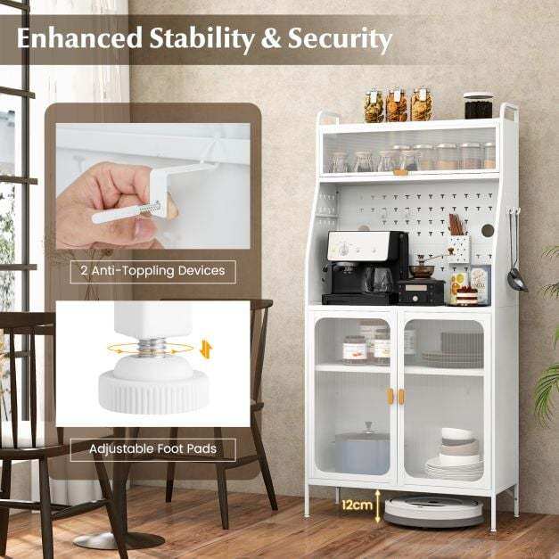 Maximize the storage potential of your kitchen, living room or entryway with the metal cabinet. This sturdy and durable cabinet offers plenty of storage space for your living area. 2 adjustable shelves ( 3 cm for each level) ensure easy organization of items of all sizes. The cabinet's durable and hard-wearing surface ensures long-lasting use. The one-piece metal frame provides stability and large weight capacity. And the cabinet has 4 smooth universal wheels that allow you to move it around. Two of the wheels are lockable, providing added security and stability. More, the safe anti-toppling device can help fix the cabinet on the wall and prevent the cabinet from tipping over. Whether it's for your bathroom, living room, kitchen or entryway, our modern sideboard cabinet blends perfectly with any decoration.