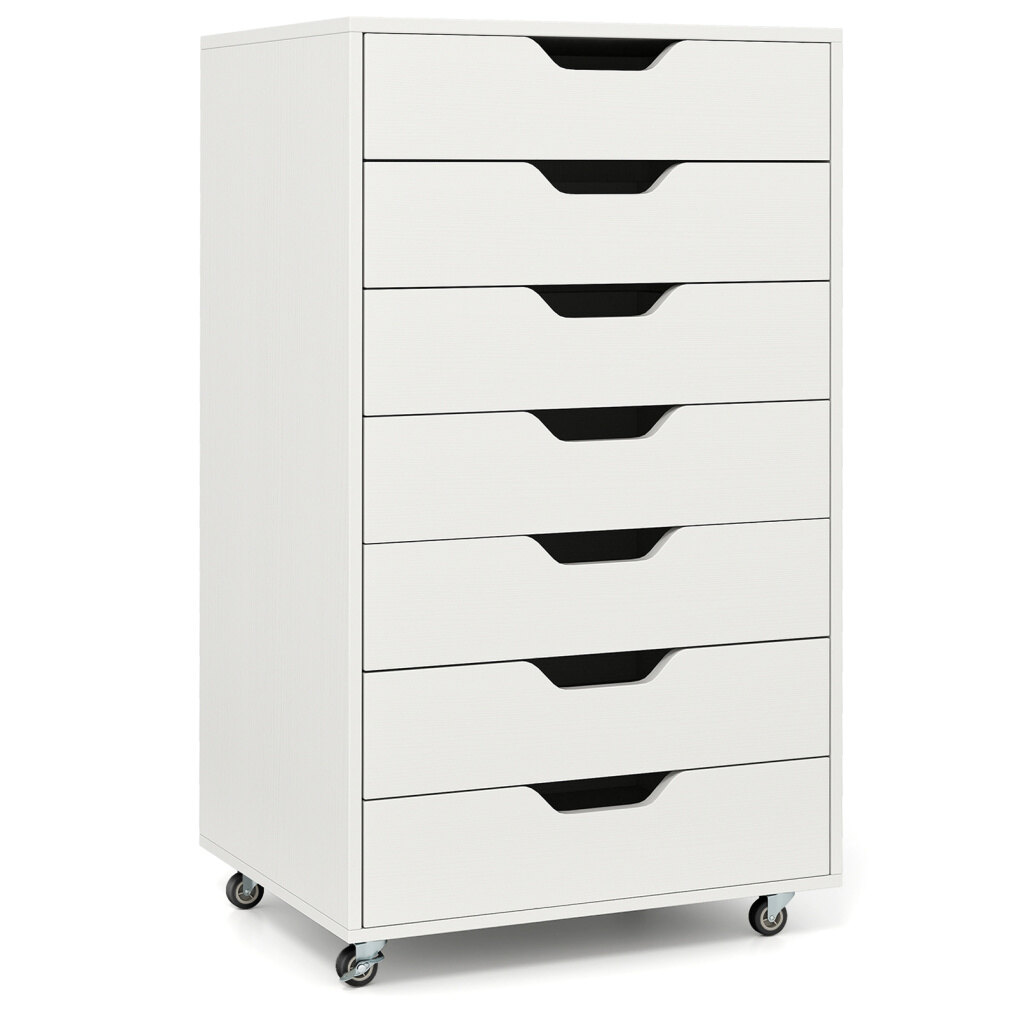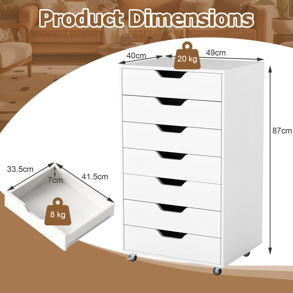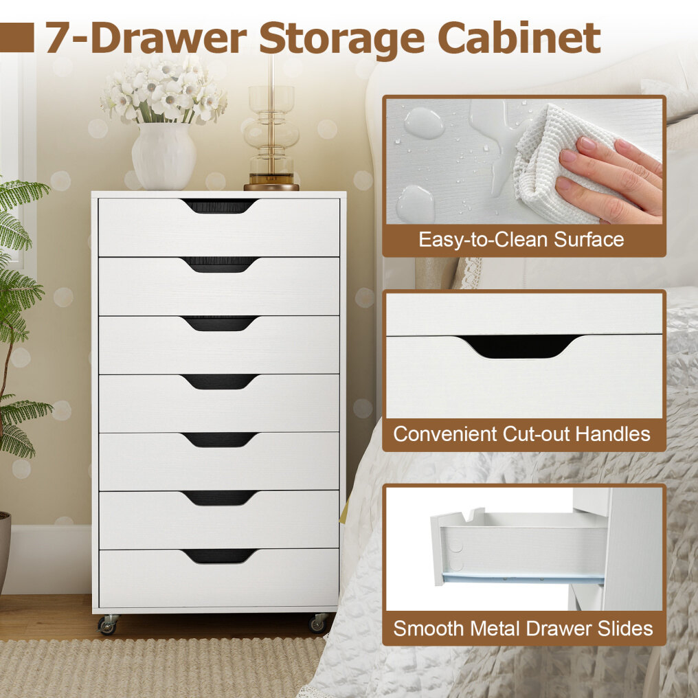 Maximize your space with this versatile 7-drawer cabinet that effortlessly organizes office supplies, snacks, cosmetics, and more. Each drawer opens easily thanks to smooth metal runners, while recessed handles provide added convenience. Equipped with 4 universal casters and 2 locking brakes, this cabinet moves effortlessly yet stays securely in place. The sturdy wooden frame and anti-tip kit ensure lasting stability and safety. This stylish rolling cabinet fits seamlessly into any room, keeping your essentials organized and within easy reach.