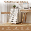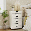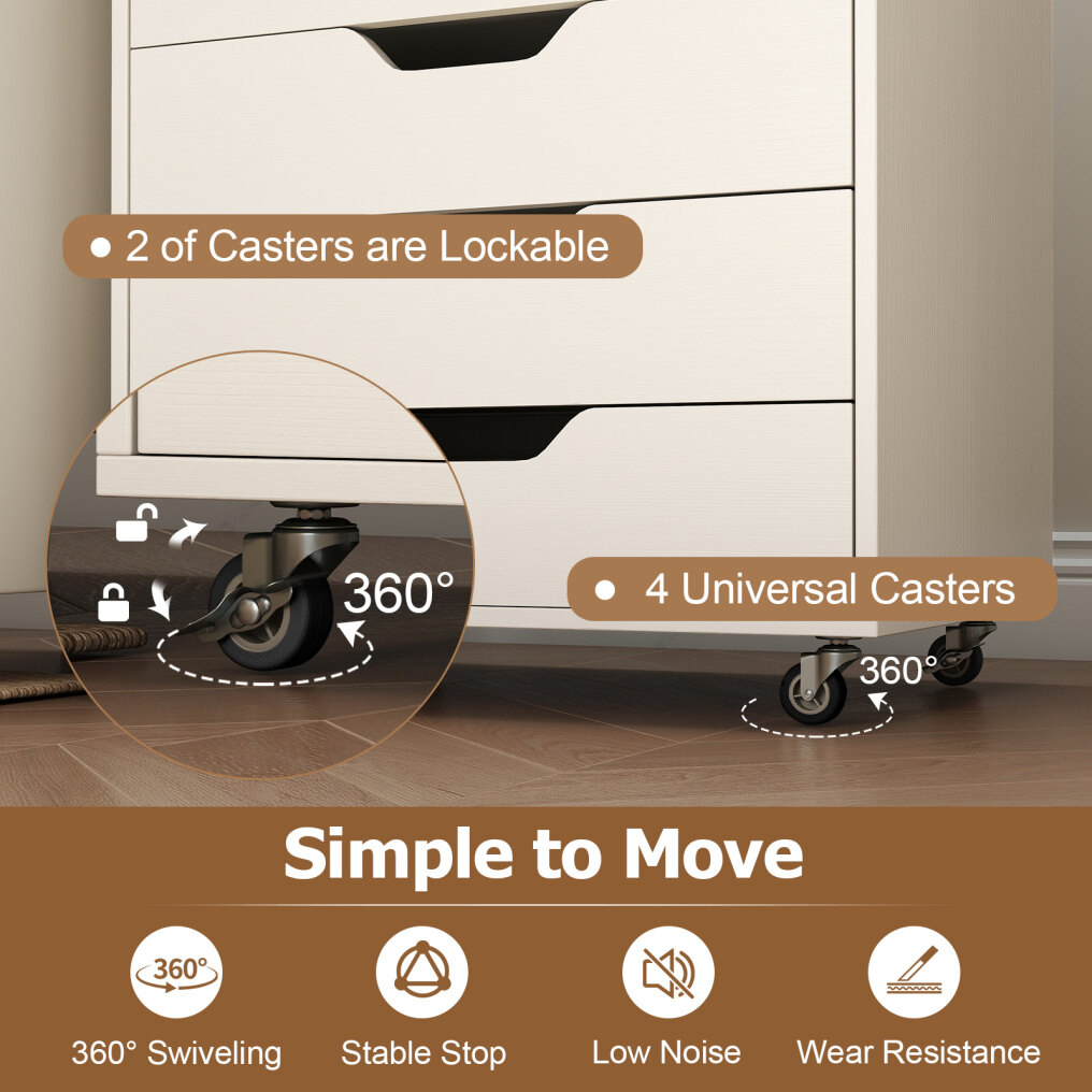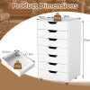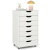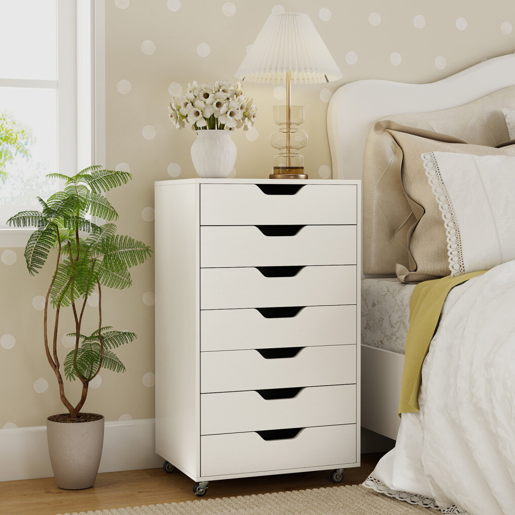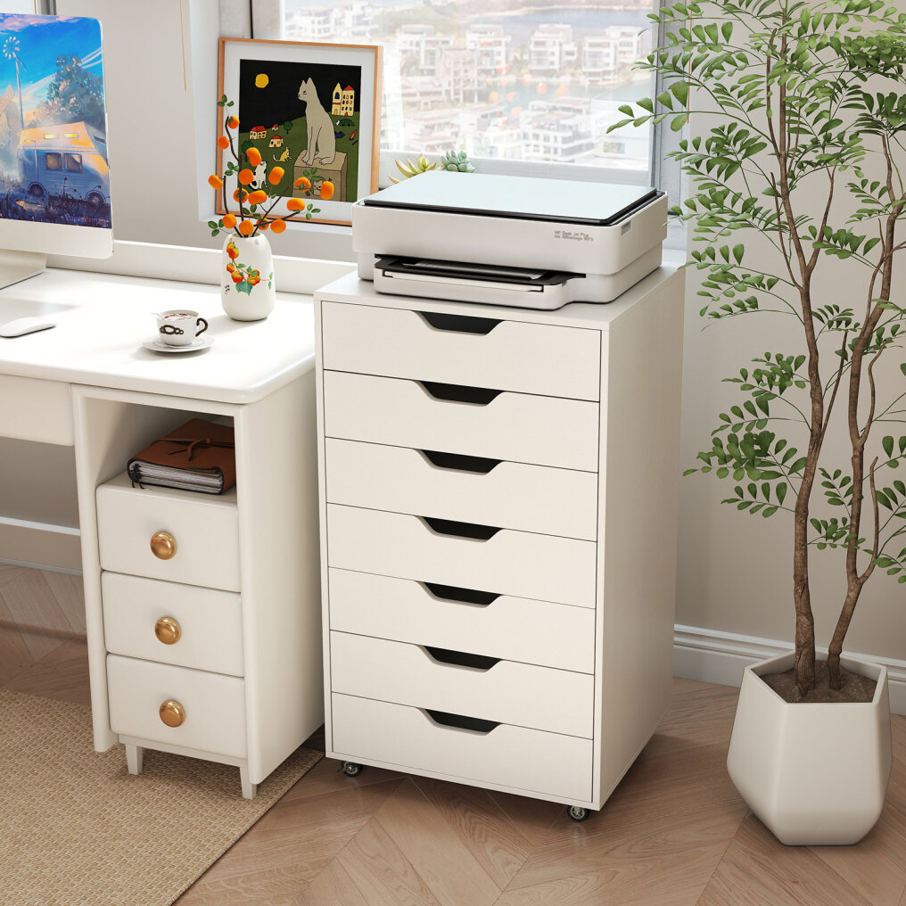 Maximize your space with this versatile 7-drawer cabinet that effortlessly organizes office supplies, snacks, cosmetics, and more. Each drawer opens easily thanks to smooth metal runners, while recessed handles provide added convenience. Equipped with 4 universal casters and 2 locking brakes, this cabinet moves effortlessly yet stays securely in place. The sturdy wooden frame and anti-tip kit ensure lasting stability and safety. This stylish rolling cabinet fits seamlessly into any room, keeping your essentials organized and within easy reach.