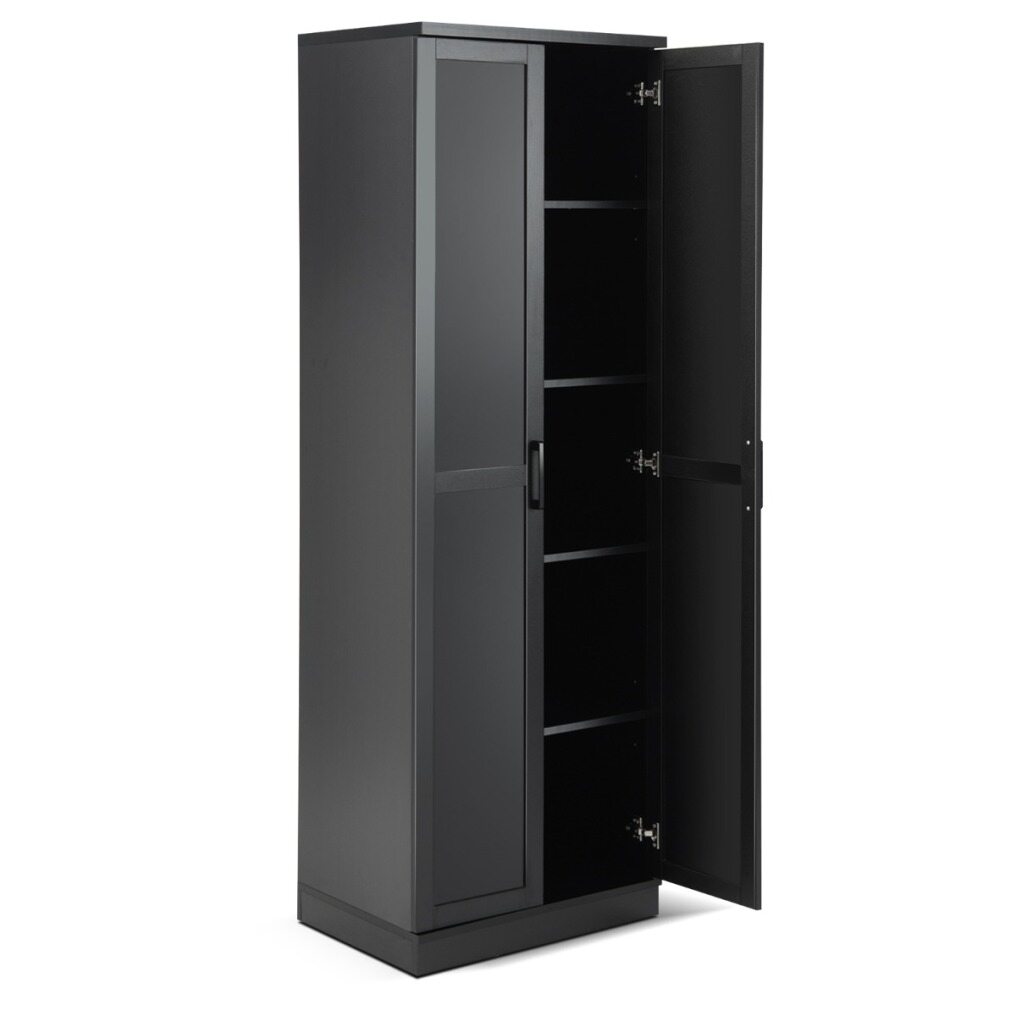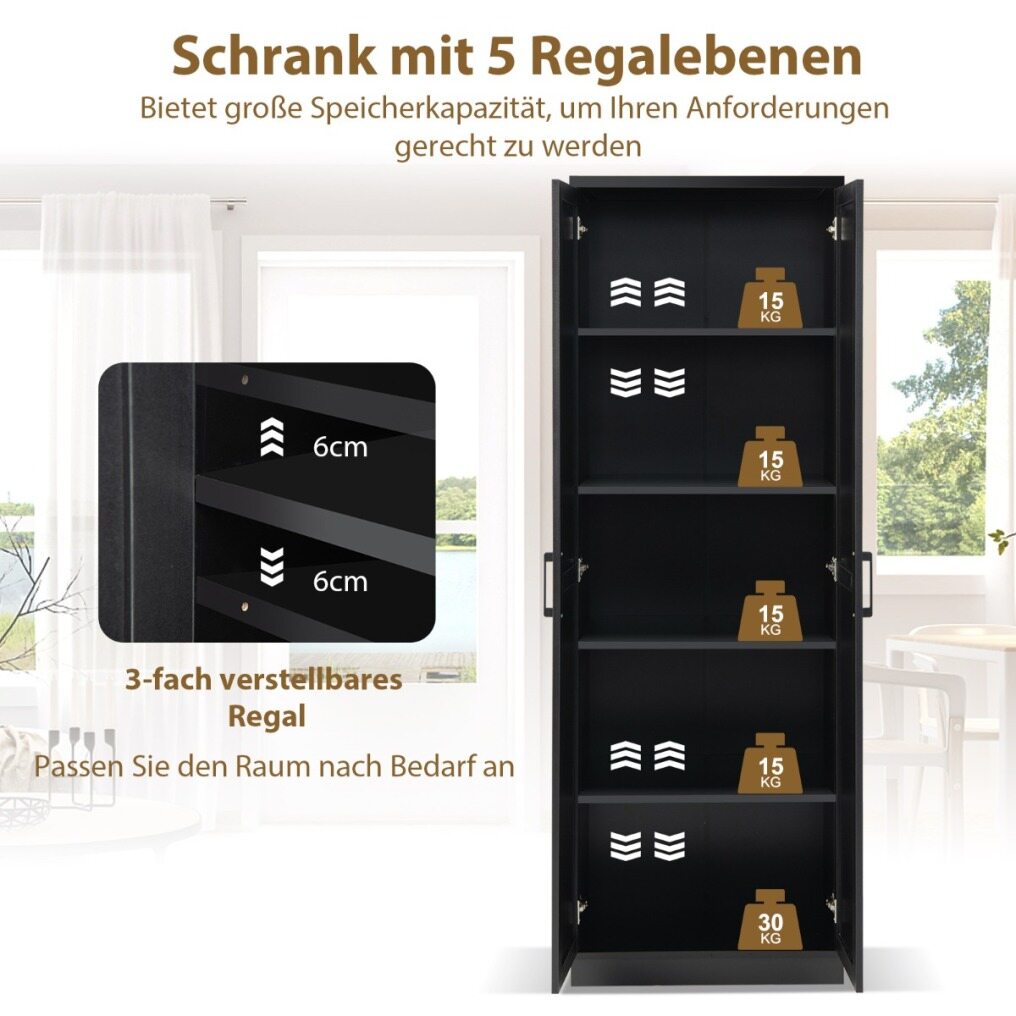 5 Tier Storage Space & Adjustable Shelves : This tall cabinet provides you with 5 tiers of shelves, allowing you to store your items such as clothes, kitchen utensils and other tools more neatly. Two of the shelves are height-adjustable, so you can adjust the space to suit the size of the items.