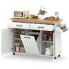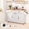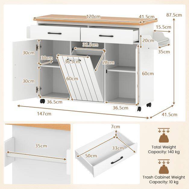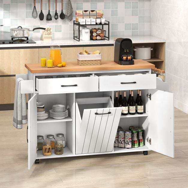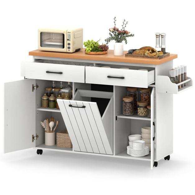 It offers a broad countertop, spice rack and 2 drawers, catering to your various culinary need. Moreover, each side cabinet is equipped with a 3-position shelf, ensuring it comfortably fits items of varying sizes. The integrated towel rack doubles as a handy push handle, enhancing the island table’s practicality. For those who value neatness, the kitchen island cleverly conceals waste with a designated storage that fits 4-gallon trash bags, complete with 2 hooks for secure hanging. The island cart features smooth mobility with its 6 universal wheels, making repositioning a breeze, and 2 can be locked to provide stability as you work.