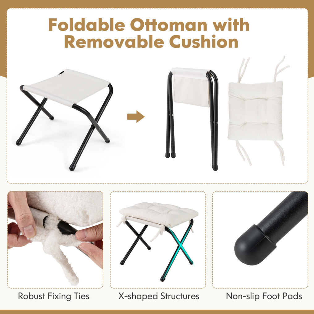 ● Multipurpose Ottoman: This accent chair comes with an ottoman that can be used as a coffee table, extra seat, or footrest. When not in use, it can be easily folded up into an X-shaped structure. Additionally, the cushion on the footrest can be removed with robust fixing ties.