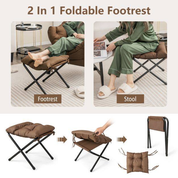 ● 2 In 1 Foldable Footrest: The comfy accent chair comes with a footrest, on which you can rest your legs for relaxation. What's more, the footrest also doubles up as an extra stool, offering additional seating as needed. When not using it, you can quickly fold it up for easy storage.