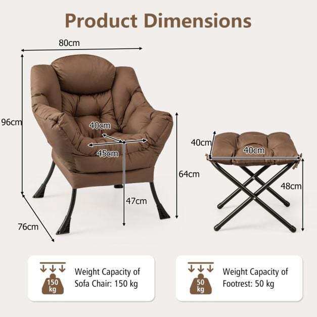● Easy Assembly in 6 Steps: The leisure sofa chair with footrest is easy to assemble by the following steps: 1. Connect the supporting tubes; 2. Place the cover on; 3. Tie the buckle; 4. Zip up the cover; 5. Fix with the hook and loop fasteners; 6. Secure with fixing straps.