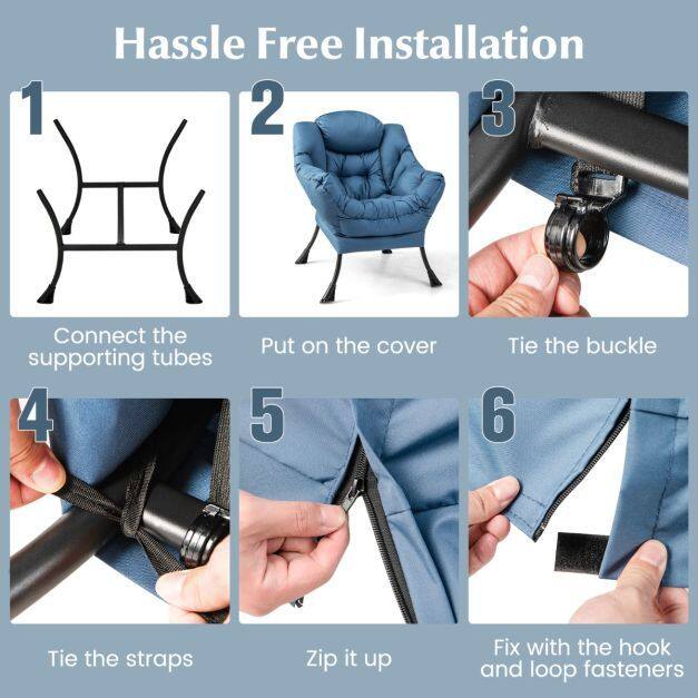 ● Easy Assembly in 6 Steps: The leisure sofa chair with footrest is easy to assemble by the following steps: 1. Connect the supporting tubes; 2. Place the cover on; 3. Tie the buckle; 4. Zip up the cover; 5. Fix with the hook and loop fasteners; 6. Secure with fixing straps.