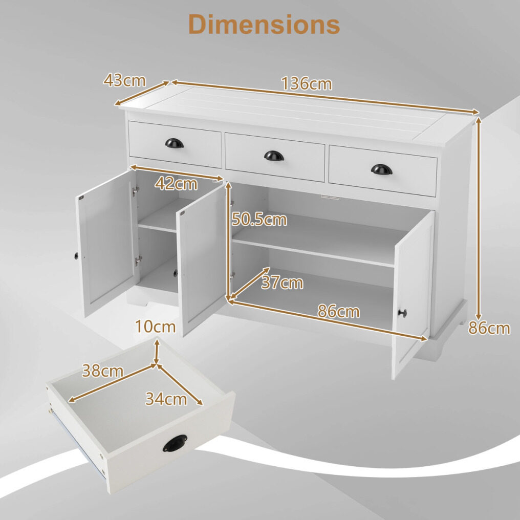Spacious Storage Solutions: This elegant buffet sideboard boasts a 136cm wide tabletop paired with 3 storage drawers and a 3-door cabinet, including 2-tier shelving. It provides ample space to store kitchenware or personal items to ensure a tidy culinary space.