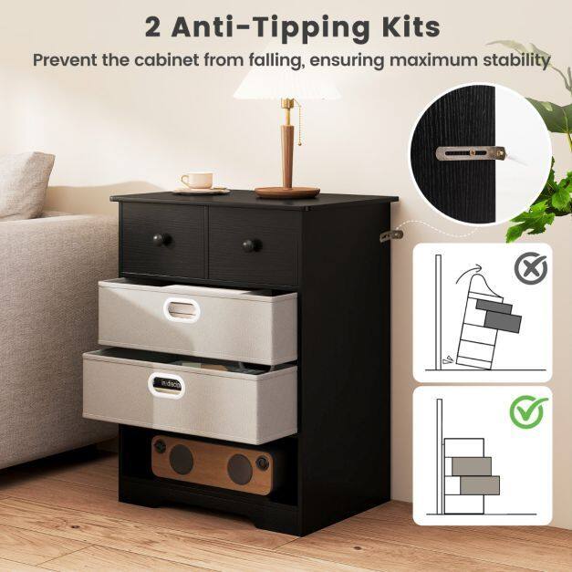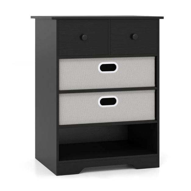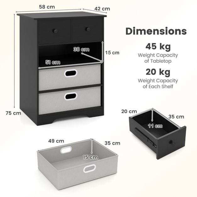 Transform your cluttered room into an oasis of calm with this chic 4-drawer nightstand! Store everything from books to gadgets effortlessly, thanks to the mix of 2 small drawers and 2 large drawers. Customize it to your heart’s content with 2 foldable, removable fabric drawers that adapt to your storage needs. Not just functional but also sleek, this easy-to-clean unit fits seamlessly into any decoration scheme. Safety-first design features like 2 anti-tip kits and smooth edges turn this fashionable piece into a family-friendly staple. Ideal for any space, measuring 58cm x 42cm x 75cm (L x W x H). Bring sleek organization and modern style directly to your home!