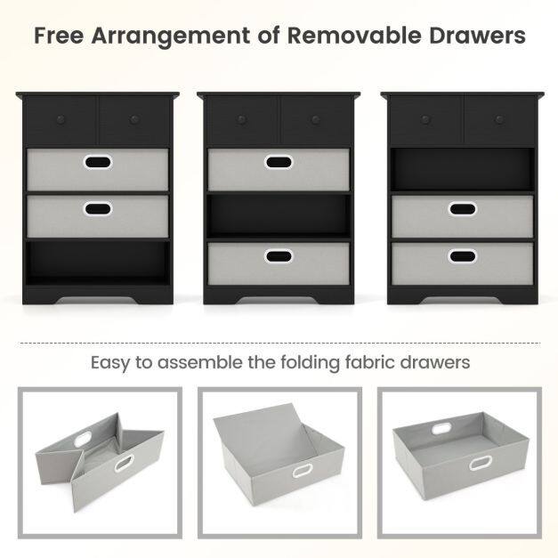 Flexible Drawer Configuration: The 2 fabric drawers of the storage dresser are both foldable and removable, allowing you to customize your storage. You can easily adjust the placement of the 2 fabric drawers among the 3 compartments to suit your organizational needs.