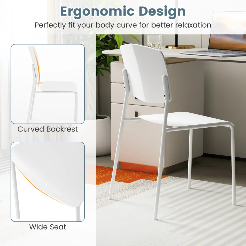 This dining chair set includes 2 chairs, and you can purchase more chairs to pair with different-sized dining tables. With its simple silhouettes and chic look, this modern minimalist dining chair set adds a touch of charm and elegance to your dining area. Constructed of high-strength metal supporting legs and high-quality PP seats, the chairs provide a sturdy and stable foundation for a secure seating experience. Additionally, the curved backrest and wide seat are designed to perfectly fit your body curve for better relaxation. When not in use, the armless chairs can be stacked for space-saving storage, which is perfect for maximizing your living space and maintaining a clutter-free environment.