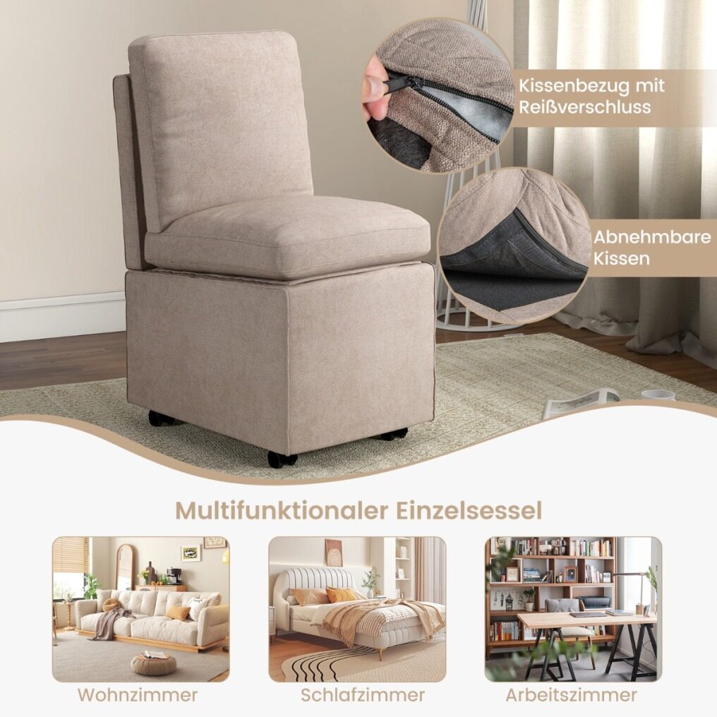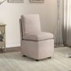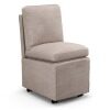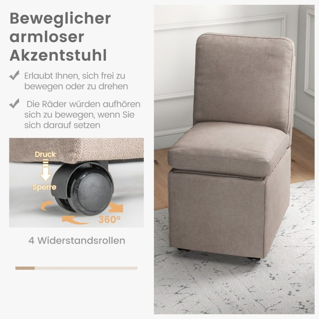 Get ready to experience ultimate comfort with the soft seating of this chair. Equipped with two thick cushions, this chair provides an exceptional level of comfort. Made with breathable linen fabric and filled with ultra-soft duck down fluffing, it conforms to the contours of your body for a truly ergonomic experience. Feel the stress melt away as you sink into the cozy embrace of this chair. But that's not all! This chair also comes with a hidden storage compartment, perfect for keeping your living space tidy and organized. For added convenience, this chair is equipped with wheels that provide both mobility and stability. The resistance wheels ensure that the chair remains stationary when you're sitting on it, giving you a worry-free seating experience. Versatile and stylish, this armless accent chair is a perfect addition to any room. Use it in your living room, bedroom, home office, or even as a reading nook. Its sleek design and neutral color blend seamlessly with any decor style.