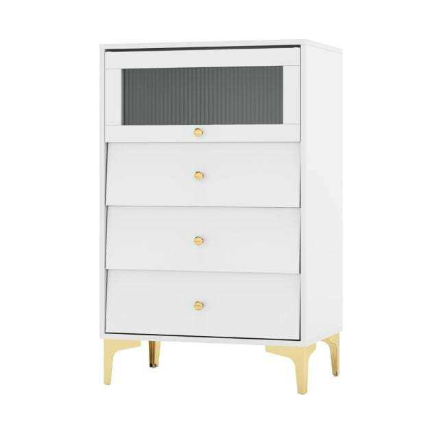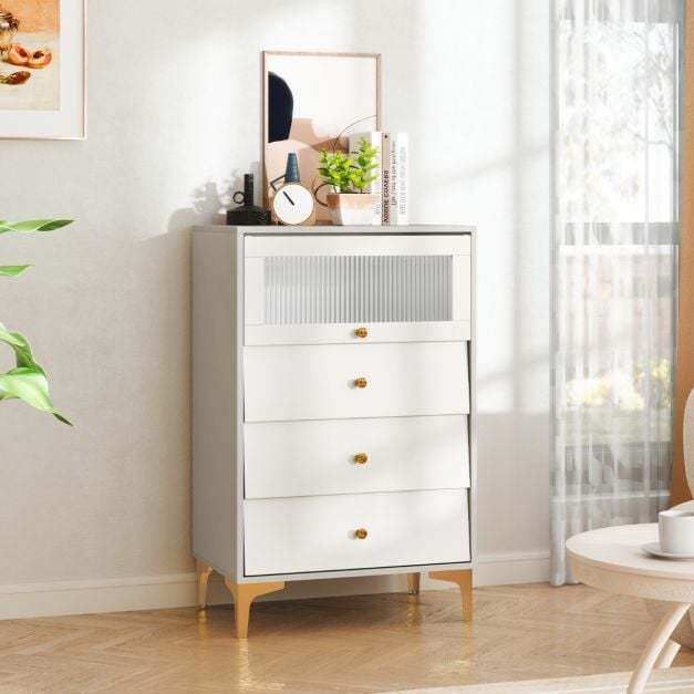 It is designed with 3/4 large drawers and 1 small cabinet to store your belongings. With L-shaped metal legs and anti-toppling design, the cabinet will remain stable and steady. Additionally, the flip up glass door allows for easy access. The handy knobs and metal slides help you easily open the drawers to access your items. The fluted glass door and inclined drawer doors bring an elegant touch to your room. You can place it in bedrooms, hallways, or entrances. Furthermore, it is easy to assemble and clean. If you are looking for such a product, do not hesitate to buy it!