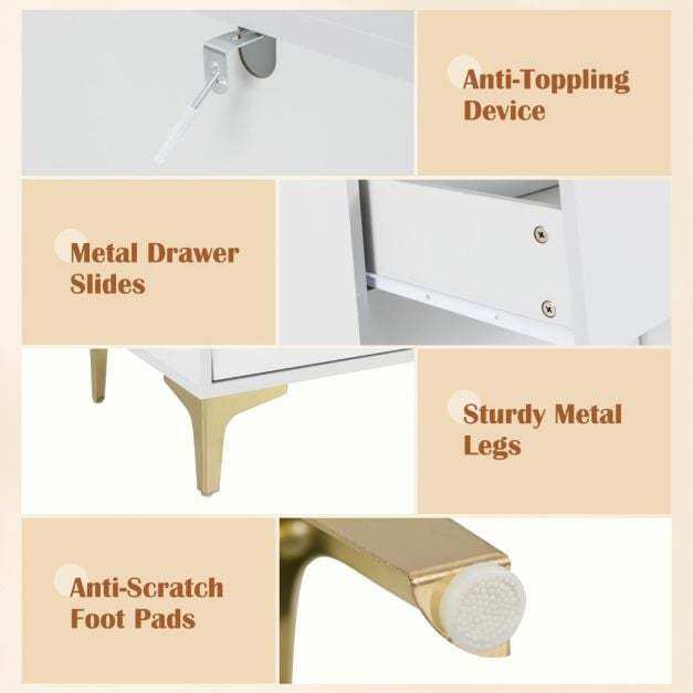 ● Reliable and Sturdy Structure: The L-shaped metal legs and anti-slip foot pads ensure strong support and reliable stability. Meanwhile, it also comes with 2 anti-toppling devices to secure the cabinet to the wall for higher safety and sturdiness.