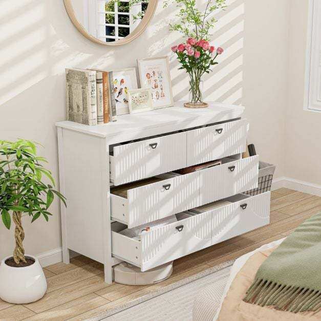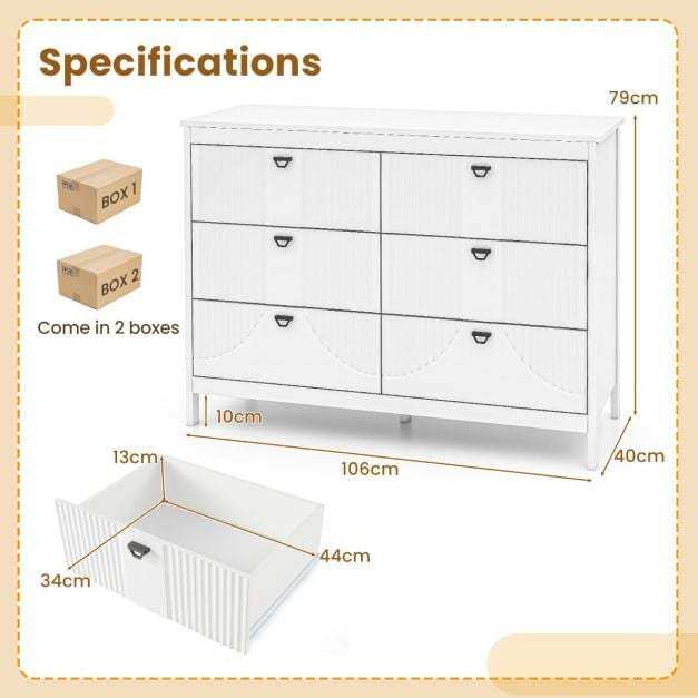 Versatile Usage: The chest of 6 drawers functions seamlessly as a bedroom storage chest, buffet cabinet or stylish office storage cabinet, catering to a range of needs. There's no doubt that its modern look and adaptable design will blend effortlessly into any indoor settings.