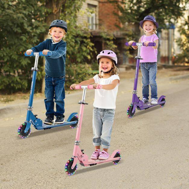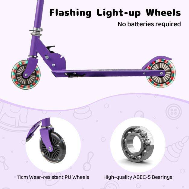 PU Wheels with LED Lights: This foldable kids scooter is equipped with 2 LED light wheels (no batteries required), making your ride even more fun. The 12cm wear-resistant PU wheels with high-quality ABEC-5 bearings ensure a smooth and stable ride.